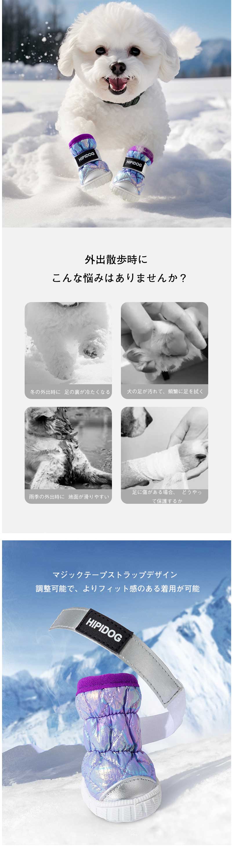 商品情報注意事項・使用前には必ず爪や肉球のまわりの毛を切ってください。靴が脱げやすくなったりズレる原因になります。・犬種によっては前足と後ろ脚のサイズが異なる場合がございます。その場合は大きいほうの足に合わせてください。・事故防止のため、適応サイズ・適応体重以外のワンちゃんには使用しないで下さい。※手作業で計測しているため、サイズに多少の誤差がございます。※商品写真はできる限り実物に近づけるようにしておりますが、お使いのモニター設定やお部屋の照明等により実際の商品と色味が異なる場合がごさいます。犬靴 ドッグブーツ 冬用 保温 防水 防寒 暖かい 撥水 丈夫 雪遊び 秋冬 裏起毛 ゴム底 肉球保護 汚れ防止 犬用靴 シューズ 傷防止 軽量 長靴 ペット用品 滑り止め 散歩介護 防寒着 お散歩 お出掛け 柔らかい 小型犬 中型犬 大型犬 4個入り 雪や冷えから足を守る 4個入り 脱げにくい 履かせやすい 滑り止め 肉球保護 汚れ防止 注意事項・使用前には必ず爪や肉球のまわりの毛を切ってください。靴が脱げやすくなったりズレる原因になります。・犬種によっては前足と後ろ脚のサイズが異なる場合がございます。その場合は大きいほうの足に合わせてください。・事故防止のため、適応サイズ・適応体重以外のワンちゃんには使用しないで下さい。※手作業で計測しているため、サイズに多少の誤差がございます。※商品写真はできる限り実物に近づけるようにしておりますが、お使いのモニター設定やお部屋の照明等により実際の商品と色味が異なる場合がごさいます。 5