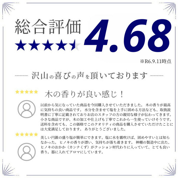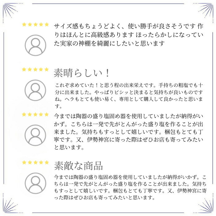商品説明盛り塩固め器 円錐 通常タイプお塩をきれいな円錐形に盛ることができます。材質は伊勢神宮のご用材でもある桧製です。神様へのお供え物(御饌)、お部屋の浄化、トイレ、お風呂、玄関などあらゆる場所で盛り塩をしていただけます。材料から製造まで全て日本国内ですので純国産のお品で御座います。伊勢の神棚職人が丁寧にお造りした拘りの製品です。円錐型のサイズは全部で4種類ありますのでご希望の大きさをお求め下さい。日本の総氏神ともいわれる伊勢の神宮風水の第一人者Dr.コパ先生も書かれているように、伊勢神宮は日本最高の聖地、パワースポットです。その伊勢の地から宮忠がお届けする盛り塩グッズの円錐固め器・三角錐固め器には、神都伊勢で作りお届けしている証(あかし)に宮忠の刻印が打たれています。サイズ幅43×奥行43×高62mm【出来上る盛塩の大きさ】幅37×奥行37×高40mm※手造りの品ですのでサイズ誤差は生じます。材質国産桧お手入れの方法木製品のため水洗いはしないでください。お手入れの際は熱い目のお湯で硬く絞った布巾などで拭くようにしてください。替え時・処分の方法お塩で清め、可燃物として処分してください。Q&AQ.お塩の交換はいつがいいですか?A.3日〜7日を目安に交換していただければと存じます。また、湿気の多い時期は頻繁に交換されると良いかと存じます。Q.使い終わったお塩はどのように処分すれば良いですか?A.神様へのお供え物の盛り塩でしたら日々のお食事にご使用下さい。浄化用でしたら感謝の気持ちを持ちながら水へ流していただければと存じます。Q.お店でも販売していますか?伊勢神宮に参拝する際に店舗で直接購入したいです。A.はい。伊勢宮忠本店、伊勢宮忠おかげ横丁、内宮前伊勢おきよめの店で販売しております。伊勢土産としても人気のお品で御座います。Q.盛り塩固め器は宮忠さんの工場で作っていますか? 海外製は不安です。国産のものなら安心できますA.はい。弊社の盛り塩固め器は全て宮忠本社工場で製造しています。材木、製造地共に日本国内ですので純国産のお品で御座います。ご使用用途盛り塩 セット 固め器 型 結婚祝い お祝い 御祝 内祝 内祝い 父の日 母の日 敬老の日 お祝い返し ウェディングギフト ブライダルギフト バレンタインデー ホワイトデー 贈り物 引き出物 引出物 結婚 出産 ギフト 贈答品 記念日 誕生日 クリスマス お正月 新学期 新生活 記念品 おしゃれ 大 卒業記念品 お返し お礼 御礼 ごあいさつ ご挨拶 御挨拶 プレゼント お見舞い 皿 お餞別 引越しご挨拶 入園 入学祝い 卒園祝い 卒業祝い 就職祝い 新築祝い 引越し祝い 快気祝い 開店祝い 二次会 披露宴 結婚式 出産祝い 初節句 七五三 成人式 昇進祝い 新築 上棟 引っ越し 引越し祝い 開店 退職 快気 全快祝い 初老 還暦 縁起物 縁起担ぎ 国産 古稀 喜寿 傘寿 米寿 卒寿 白寿 長寿 金婚式 銀婚式 ダイヤモンド婚式 結婚記念日 木婚式 定年 景品 賞品 プレゼント 贈り物 実用的 浄化 祓い 払い 清め 塩 ソルト 持塩 持ち塩 包み紙 ケース 巾着 和紙 持ち塩入れ 盛り塩 トラベル 旅行 お守り 御守 おまもり 護符 厄除 厄払 厄祓 宮忠 神棚 神具 伊勢 お土産 ネット 伊勢土産 お伊勢さん おいせさん 伊勢神宮 塩 お守り 厄年 ゲン担ぎ 持ち歩く塩 お祓い塩 安心 交通安全商品説明盛り塩固め器 円錐 通常タイプお塩をきれいな円錐形に盛ることができます。材質は伊勢神宮のご用材でもある桧製です。神様へのお供え物(御饌)、お部屋の浄化、トイレ、お風呂、玄関などあらゆる場所で盛り塩をしていただけます。材料から製造まで全て日本国内ですので純国産のお品で御座います。伊勢の神棚職人が丁寧にお造りした拘りの製品です。円錐型のサイズは全部で4種類ありますのでご希望の大きさをお求め下さい。日本の総氏神ともいわれる伊勢の神宮風水の第一人者Dr.コパ先生も書かれているように、伊勢神宮は日本最高の聖地、パワースポットです。その伊勢の地から宮忠がお届けする盛り塩グッズの円錐固め器・三角錐固め器には、神都伊勢で作りお届けしている証(あかし)に宮忠の刻印が打たれています。サイズ幅43×奥行43×高62mm【出来上る盛塩の大きさ】幅37×奥行37×高40mm※手造りの品ですのでサイズ誤差は生じます。材質国産桧お手入れの方法木製品のため水洗いはしないでください。お手入れの際は熱い目のお湯で硬く絞った布巾などで拭くようにしてください。替え時・処分の方法お塩で清め、可燃物として処分してください。Q&AQ.お塩の交換はいつがいいですか?A.3日〜7日を目安に交換していただければと存じます。また、湿気の多い時期は頻繁に交換されると良いかと存じます。Q.使い終わったお塩はどのように処分すれば良いですか?A.神様へのお供え物の盛り塩でしたら日々のお食事にご使用下さい。浄化用でしたら感謝の気持ちを持ちながら水へ流していただければと存じます。Q.お店でも販売していますか?伊勢神宮に参拝する際に店舗で直接購入したいで