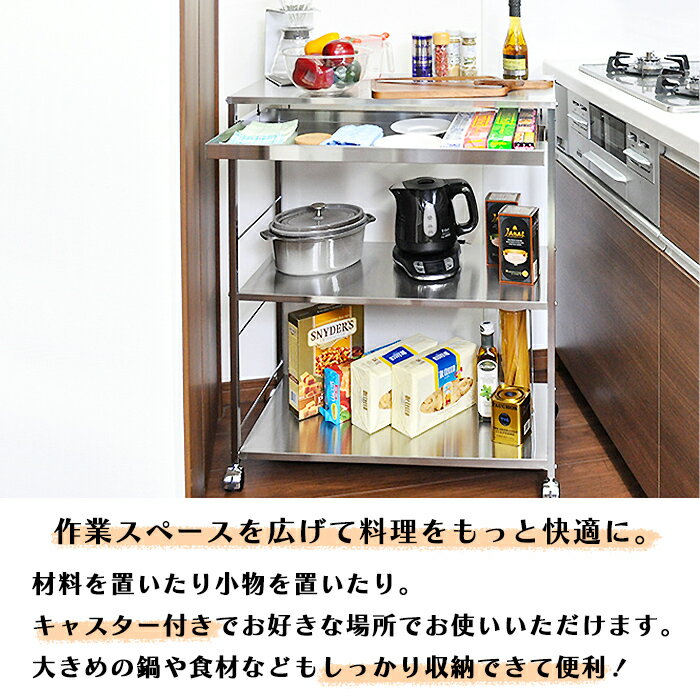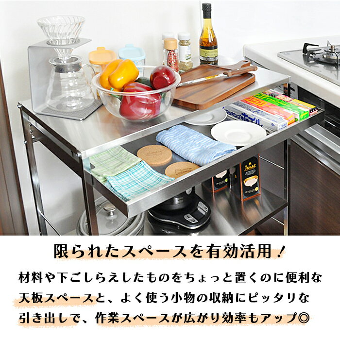 ----------------- 商品詳細 ----------------- サイズ(約):幅73.5×奥行38×高さ85.5cm[引出し有効内寸] 幅64×奥行32×高さ7cm 材質: [本体] ステンレス [フレーム] スチール(クロムメッキ) 重量(約):9kg 耐荷重(約):[天板]10kg、[中棚]5kg、[下棚]10kg、[引出し]2kg 生産国:日本 組立て:お客様組立て品 ※キャスター×4個(内ストッパー付×2個) ※天板四隅に保護キャップ付き ----------------- [商品の説明] シンプルなデザインのステンレス製キッチンワゴン。 天板下には引出しが付いており、小物類の収納に便利です。 キッチンワゴンとしてはもちろん、調理台や作業台、サイドワゴンなど多用途に使えます。 天板の四隅には保護キャップが付いており、日本製ならではの高品質な造りと、安全性への配慮がされた多機能なワゴンです。----------------- 商品詳細 ----------------- サイズ(約):幅73.5×奥行38×高さ85.5cm[引出し有効内寸] 幅64×奥行32×高さ7cm 材質: [本体] ステンレス [フレーム] スチール(クロムメッキ) 重量(約):9kg 耐荷重(約):[天板]10kg、[中棚]5kg、[下棚]10kg、[引出し]2kg 生産国:日本 組立て:お客様組立て品 ※キャスター×4個(内ストッパー付×2個) ※天板四隅に保護キャップ付き ----------------- [商品の説明] シンプルなデザインのステンレス製キッチンワゴン。 天板下には引出しが付いており、小物類の収納に便利です。 キッチンワゴンとしてはもちろん、調理台や作業台、サイドワゴンなど多用途に使えます。 天板の四隅には保護キャップが付いており、日本製ならではの高品質な造りと、安全性への配慮がされた多機能なワゴンです。