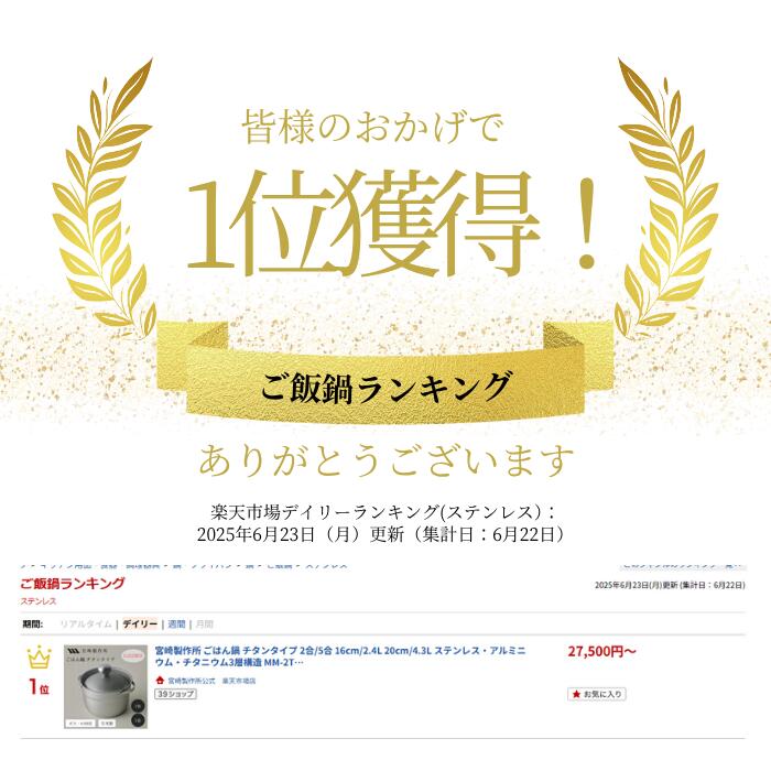 鍋炊きごはんの美味しさを もっと手軽に、簡単に。 商品詳細 商品名 宮崎製作所 ごはん鍋 チタンタイプ サイズ チタンタイプ2合 幅:22.6cm 奥行:18.2cm 深さ:12.8cm 高さ:16.1cm チタンタイプ5合 幅:25.3cm 奥行:22.2cm 深さ:14.5cm 高さ:17.4cm 重量 2合:1030g 5合:1270g 容量 2合:満水容量2.4L 5合:満水容量4.3L 内容量 2合:1個(蓋付) 5合:1個(蓋付) 材質 本体:全面チタニウム・アルミニウム・ステンレス三層鋼 蓋:チタニウム つまみ・ハンドル:18-8ステンレス 熱源 ガス・IH・ハロゲンヒーター・クッキングヒーター・オーブン 生産地/製造元 日本(燕三条)/株式会社 宮崎製作所 ギフト 無料ギフトラッピング対応あり 備考 ※食器洗い乾燥機でのご使用は劣化を早める可能性があります。 ※電子レンジにはご使用いただけません。 ※モニターの発色の具合によって、実際の商品と色が異なって見える場合がございます。【鍋炊きごはんの美味しさをもっと手軽に、簡単に。】 鍋炊きごはんは、お米本来の甘みと香りを引き出し、炊飯器では味わえない旨み際立つごはんを実現します。「ごはん鍋」は、そんな特別な炊き上がりを毎日の食卓に届けるために開発されました。ステンレス製で扱いやすく、吹きこぼれにくい構造で、お手入れも簡単。炊飯だけでなく、麺茹でやスープ、煮込み料理にも幅広く活躍します。毎日の料理がもっと快適に、もっと美味しくなる、頼れる道具です。 【ごはんの仕上がりと道具の快適さ、その両方を追求したお鍋です。】 美味しい料理を作るための性能と、毎日使う道具としての快適さ。そのどちらも妥協せずに設計されたのが「ごはん鍋」です。炊飯だけでなく、煮込みやスープなど幅広い料理にも活躍する、日々の食卓を支える頼れる存在です。 【お米本来の味を引き出すチタンタイプ】 金属イオンの溶出がないことで知られるチタンは、風味や色、香りを損なうことなくお米本来の味をより一層引き出します。ステンレスタイプでも十分美味しく炊き上がりますが、さらにお米本来の味を余すことなく堪能したい方には、チタンタイプがおすすめです。 【ふっくら炊き上がる形状】 鍋全体が丸みを帯びた形状は、お米が鍋の中で自然に対流しやすく、熱をムラなく行き渡らせる工夫が施されています。この絶妙な形状により、お米一粒一粒にしっかりと熱が伝わり、ふっくらとした食感と均一な炊き上がりを実現します。 【お米の甘みを引き出す三層構造】 蓄熱性と熱伝導の両方を叶えるために設計された三層構造が、鍋全体を効率的に加熱。お米の芯までしっかり熱を届けることで、お米本来の甘みを引き出します。 【タフで便利な使い勝手】 耐久性に優れたステンレス製で、欠けたり割れたりする心配がなく、鍋の中でそのままお米を研ぐこともできます。また、水切れの良い縁の形状や目盛り付きのデザインで、調理の準備もスムーズに。 【スピーディーな炊き上がり】 中火で沸騰させた後に弱火で10分、蒸らし10分というシンプルな手順で、ふっくら美味しいごはんを炊き上げます。炊飯器よりも約15分短い調理時間で仕上がるため、忙しい日々の食卓を効率よくサポートします。 【吹きこぼれにくくお手入れが簡単】 鍋内側に設けられた段差が吹きこぼれを防ぎ、炊飯中の手間を軽減します。さらに、付属部品のないシンプルな設計で、お手入れもラクラク。ステンレス製だから頑丈で、食器洗い乾燥機にも対応。 【炊飯だけじゃない万能鍋】 吹きこぼれを防ぐ段差構造で、麺茹でや、深さを活かした具だくさんのスープ作りにも活躍。炊飯だけでなく、さまざまな料理に対応する汎用性の高さが魅力です。 【どんなキッチンにも対応】 ガス、IH、ハロゲンヒーター、シーズヒーター、オーブンで使用可能。さまざまな熱源に対応し、キッチン環境を選びません。 ※電子レンジには対応していません。 【フッ素加工なしで安心・安全】 内面はフッ素加工をしていないため、コーティングが剥がれる心配もなく、安心して永くご愛用いただけます。さらに、お米が鍋にくっつきにくいので、後片付けもスムーズ。毎日の炊飯を快適にサポートします。 【ご飯の炊き方】 1.米を研ぐ 2.規定量の水を入れ、夏は30分、冬は60分浸水させる 3.フタをして中火で沸騰させる 4.沸騰したら弱火で10分 5.火を止めて10分蒸らして完成 【商品スペック】 チタンタイプ2合 幅:22.6cm 奥行:18.2cm 深さ:12.8cm 高さ:16.1cm 重量:1030g チタンタイプ5合 幅:25.3cm 奥行:22.2cm 深さ:14.5cm 高さ:17.4cm 重量:1270g ※自動炊飯機能が使えるコンロもあれば、使えないコンロもございます。 誠に申し訳ございませんが、お試しいただかないとわからないです。 もしもご協力いただけるようでしたら、ご購入いただいた方で、レビュー欄に自動炊飯器能が使えたかどうか、ご使用のガスコンロ名とともにご記載いただけますとありがたいです。