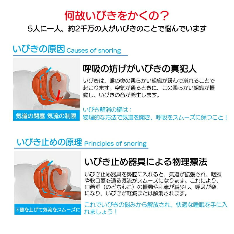 商品特徴 【高品質のシリコーン素材】 いびき防止装置は科学的に設計されており、良質なシリカゲル材質を採用し、柔らかく快適に使用されています。お手入れが簡単で、シリカゲルを取り出して温水で洗うだけです。また、新しいシリコーンアクセサリーが付属しており、何度でも繰り返し使用できます。 【物理的な方法でいびきを防ぐ】 弊店のいびき防止装置は鼻腔を通過する空気の量を増加させるよう科学的に設計されています。 健康に影響を与えず、呼吸を楽にする純粋ないびき鼻づまりの解決法です。 【超快適な材料】いびき止めは高品質の抗アレルギーシリカゲルを組み合わせたもので、皮膚を刺激しないことを確保し、人間工学に適合し、鼻の穴に適合し、大きさの異なる鼻腔を快適に装着することができます。安全、快適、耐久性、柔らかさ、柔軟性を兼ね備えています。 【3段階の風速調節可能】 -アップグレードのいびき防止装置は刺激を含まないいびき補助ツールであり、それは3段階の風速調節可能で、鼻腔を通過する気流を最大限に高め、いびきを緩和することができる。夜間の睡眠を大幅に改善します。 【USB充電&ポータブル】 -USB充電器は小型で持ち運びに便利です。 200mAhバッテリー、6-8時間安定駆動。USB充電デザイン、任意のUSB充電ポートに適した、持ち運びに便利です。 大容量バッテリーを搭載し、フル充電で6~8時間使用可能。充電中は赤いインジケーターランプが点灯し、満充電になると自動的に消灯します【使いやすい】-弊店のいびき防止装置は取り外し可能なシリカゲル固定テープが付属する、寝ている間にいびき器が外れるのを防ぐ。柔らかくて快適なシリコン鼻づまりは鼻に自動的に適応し、鼻に痛みや傷を与えることはありません。 商品仕様 【商品名】電子いびき防止グッズ 【外形寸法】約60×25.2×39mm 【カラー】ブルー、ホワイト 【重量】約114.6g(箱含め) 【バッテリー容量】 200mAh 【連続使用時間】最大6-8時間個人の使用状況による、異なる場合もございます。 【パッケージ内容】電動いびき防止器×1、取り外し可能なシリカゲル固定テープ×1、USBデータケーブル×1、説明書×1。 注意事項 初めて使用する前に必ずシリカゲル鼻栓を徹底的に洗浄してください。 使用後はぬるま湯でシリカゲル鼻栓を洗い、乾かしたり干したりするだけで繰り返し使用できます。 睡眠中に新しいアイテムを鼻に入れると、慣れるまでに時間がかかる場合があります。ですから、数日待って、デバイスを入れた状態で呼吸に順応し、睡眠といびきの質の改善を確認してください。 ラッピングは対応しておりません。予告なく仕様変更になる場合がございます。日本語表記はございません。パッケージ言語は中国語もしくは英語です。 写真はイメージです。実際の商品と若干異なる場合がございます。 基本は全国一律発送無料と対応させていただきますが、沖縄へお届けの場合は2000円の送料をご請求させていただきます。 色味やサイズが異なるなどのクレームはご対応致しかねますので、ご了承ください。 商品のサイズは採寸方法によって、若干な誤差が生じる場合はあります。ご了承ください。 こちらの対応と商品について何かご不満がありましたら、「悪い評価」を付ける前に一度当方とご連絡ください。出品者の誠意を持って最後まで対応いたします。 商品の輸送時間が長いため、発送していた際に外装の破損や輸送の途中に付いた小さなキズによる返品はお受付しかねます。 品質保証出品する商品は全て新品未使用です。販売している商品は全て新品未使用です、倉庫から出荷前に商品検査必要ですので、商品箱を開封する場合もございます、予めご了承くださいいませ。 初期不良の場合は到着後1週間以内にご連絡ください。初期不良の場合は写真やビデオをご提供下さい、確認後無料で新品交換もしくは御返金致しますのでご連絡下さい。写真やビデオをご提供出来ない場合は技術者と確認できません、返品返金対応出来ない可能性が御座います、予めご了承ください。 関連キーワード(本商品の説明ではありません) いびき防止 グッズ いびき いびき対策 いびき防止 無呼吸症候群 EMS EMA 簡単 コンパクト イビキ防止グッズ 鼾 止める 改善 プレゼント スノアサークル スノア いびき対策 いびき対策グッズ いびき予防 治し方 呼吸レス 軽量 旅行 外泊 ギフト プレゼント 誕生日 誕生日プレゼント メンズ レディース 男性 女性 男女兼用 クリスマス クリスマスプレゼント クリスマスギフト バレンタイン ホワイトデー チョコ以外 母の日ギフト 父の日ギフト 敬老の日 贈り物 寝具 睡眠グッズ 安眠グッズ 睡眠 安眠 睡眠の質 20代 30代 40代 50代 60代 70代 80代 90代 アプリ 健康 健康グッズ 鼾グッズ 鼾対策 鼾防止 イビキ対策 イビキ イビキ防止 鼾防止グッズ