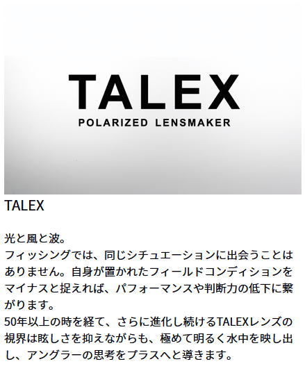 偏光度(%):99 可視光線透過率(%):30 レンズ巾(mm):54.0×42.0 フロント巾(mm):142.4 レンズ特徴:プラスチック特有の「揺れ」「ひずみ」がなく、眩しさを抑えながらも透明感溢れる視界を実現するPPL75の6カーブを搭載。エリアを問わず、様々なフィッシングシーンでアングラーの集中力を最大限に引き出すことが可能。 コーティングには、機能性にファッションセンスを盛り込んだハードマルチシングルコートをセレクト。 瞳や視線を隠せるクールなレンズ表面はアウトドアだけでなく、普段使いでも快適な視界を体感できる。 フレーム特徴:トレンドを捉えたフォルムはライフスタイルに溶け込み、フィールドでの使用だけでなく普段使いとしても活躍しオン・オフを問わず掛けることができる。 付属のノーズパッドシールを貼ることでノーズパッドの高さの調整が可能、更なるフィット感の充実を実現。無駄を省き軽さを追求したシンプルな設計は、アングラーの集中力を最大限に高める。
