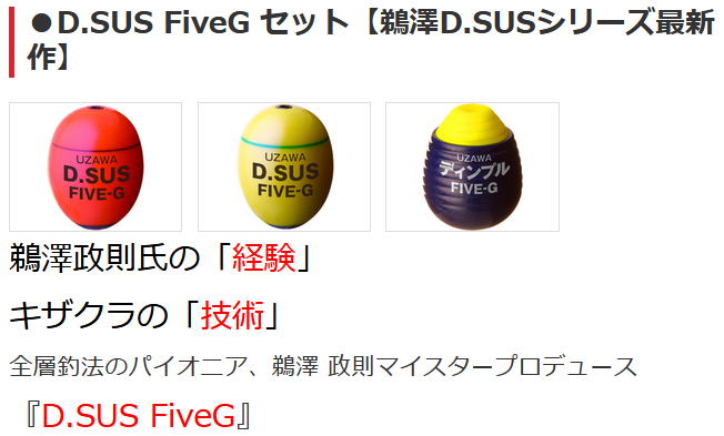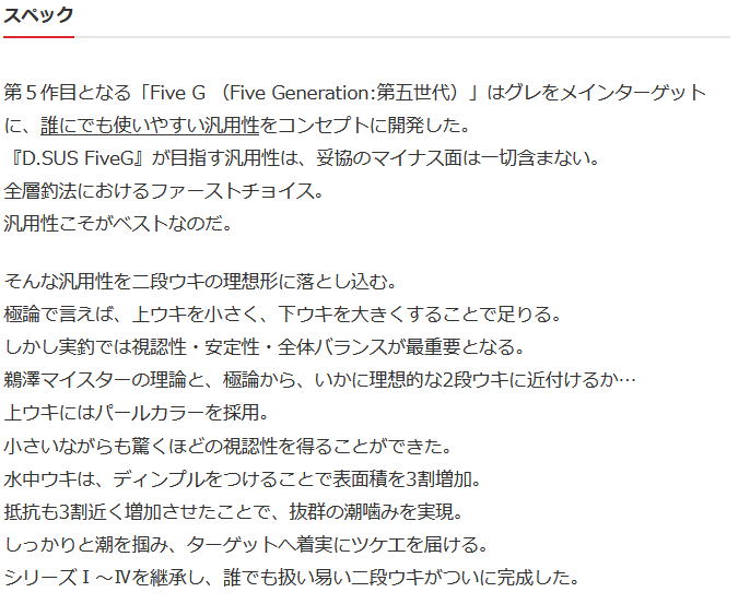 第5作目となる「Five G (Five Generation:第五世代)」は、グレをメインターゲットに、誰にでも使いやすい汎用性をコンセプトに開発した。 『D.SUS FiveG』が目指した汎用性とは、妥協や中途半端といったマイナス面は一切含まない。 全層釣法におけるファーストチョイス。 汎用性こそがベストなのだ。 そんな汎用性を二段ウキの理想形に落とし込むには… 極論で言えば、上ウキを小さく、下ウキを大きくすることではある。しかし、実際に使用する上では視認性・安定性の面で課題が多く、この理想にいかに近付けるかを徹底追求した。 上ウキは小さいながらも、パールカラーを採用したことで驚くほど視認性が良くなった。 水中ウキは、ディンプルをつけることで表面積を増やし、抵抗を3割近くアップしたことで抜群の潮噛みを実現。