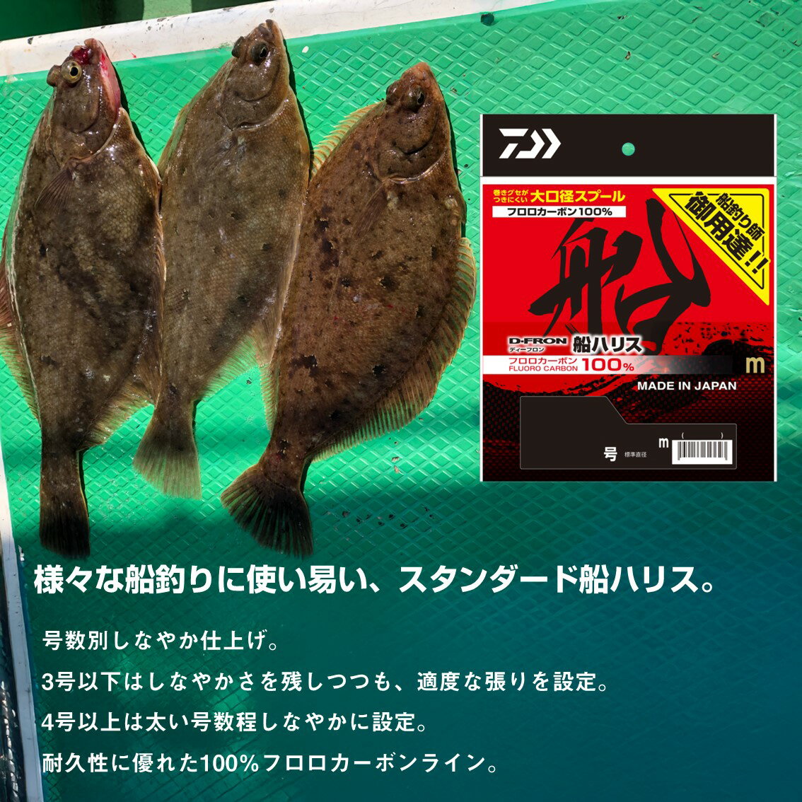 信頼のフロロハリス「ディーフロン船ハリス」がリニューアル 様々な船釣りに使い易い、スタンダード船ハリス。 号数別しなやか仕上げ。 3号以下はしなやかさを残しつつも、適度な張りを設定。 4号以上は太い号数程しなやかに設定。 耐久性に優れた100%フロロカーボンライン。 結びが強い、結節強力重視設計。 比重:1.78。