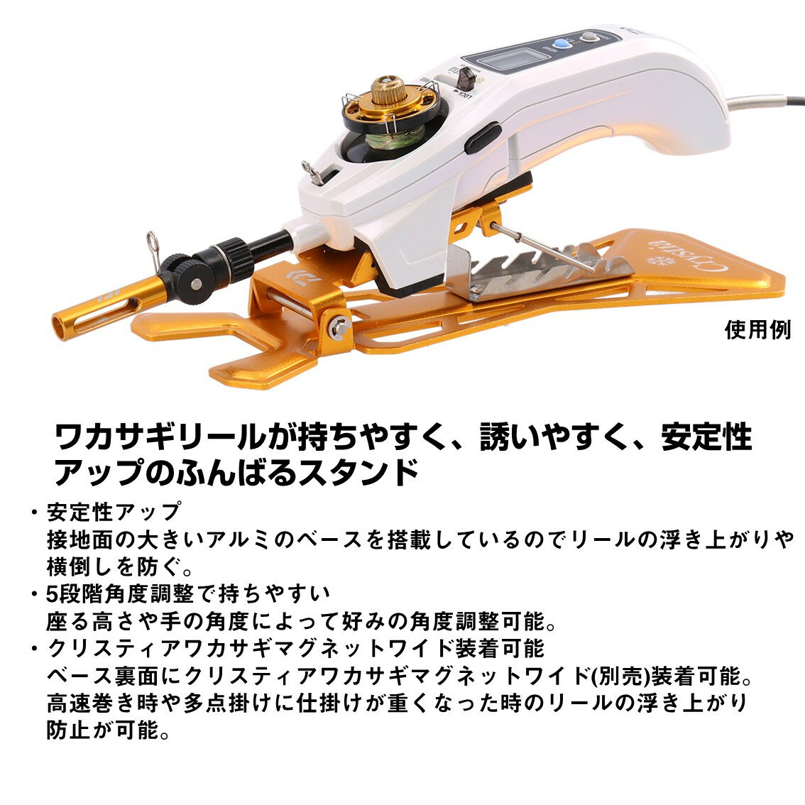 ワカサギリールが持ちやすく、誘いやすく、安定性アップのふんばるスタンド 取り付けることによってワカサギリールを持ちやすく、安定性アップ。 接地面の大きいアルミのベースを搭載しているのでリールの浮き上がりや横倒しを防ぎ安定性アップ。 5段階角度調整で持ちやすい。座る高さや手の角度によって好みの角度調整可能。 クリスティアワカサギマグネットワイド装着可能。 ベース裏面にクリスティアワカサギマグネットワイド(別売)装着可能。高速巻き時や多点掛けに仕掛けが重くなった時のリールの浮き上がり防止が可能。 *対応機種:クリスティアワカサギCRT/E/AIR/CRSシリーズ 標準自重(g):約45