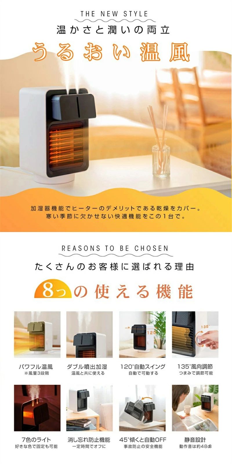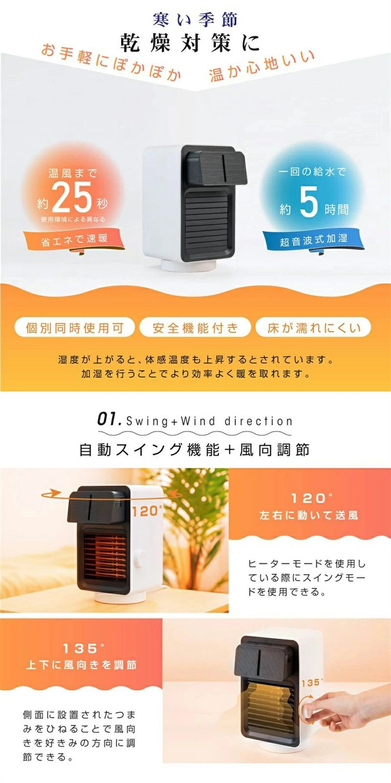 商品名 セラミックヒーター 加湿器 電気ファンヒーター 加湿ヒーター 自動首振り ヒーター 小型 セラミックヒーター 足元暖房 卓上ファンヒーター 3段階切替 首振り 大風量 安全 転倒オフ 軽量暖房器具 冷え症 寒さ対策 寝室 オフィス 脱衣所に適用製品仕様【加湿できる暖房器具】暖房だけではない!加湿機能を備えた電気ファンヒーター、体を温めながら潤いを与えます。乾燥の空気に水のような潤いを与え、長期間に使用しても肌が乾燥されることはなく、市販された電気ファンヒーターより肌に優しい。連続加湿モードは約5時間、断続加湿モードは約9時間、1日のニーズに対応できます。【3段階・首振り】送風モードが3段階備え、低温、中温と高温モードに調節できます。120℃の左右首振り機能付き、幅広い範囲まで送風でき、製品の側側にブラインドの角度を調整するハンドルがつき、ハンドルを回すことより、送風の高さを135℃の範囲に変更できます。【転倒OFF】安全に使用いただけるために、45℃傾けると自動に電源OFFになります。転倒されてもタンクに入れた水は漏れませんので、ご安心ください。商品を再起動することでまた使えます。従来の商品と違って断熱絶縁のメッシュを採用したため、不注意に触れても火傷する心配はありません。【卓上・足元暖房】2m /sの送風距離、市販品より静音で遠距離まで送風できます。周りを温めながら加湿続けますので、空気が乾燥されません。ナイトライトが付き、ベッドの隣に置いて夜の間接照明にも役たつ。タンクの水が切れた場合、加湿モードは自動にOFFとなります。