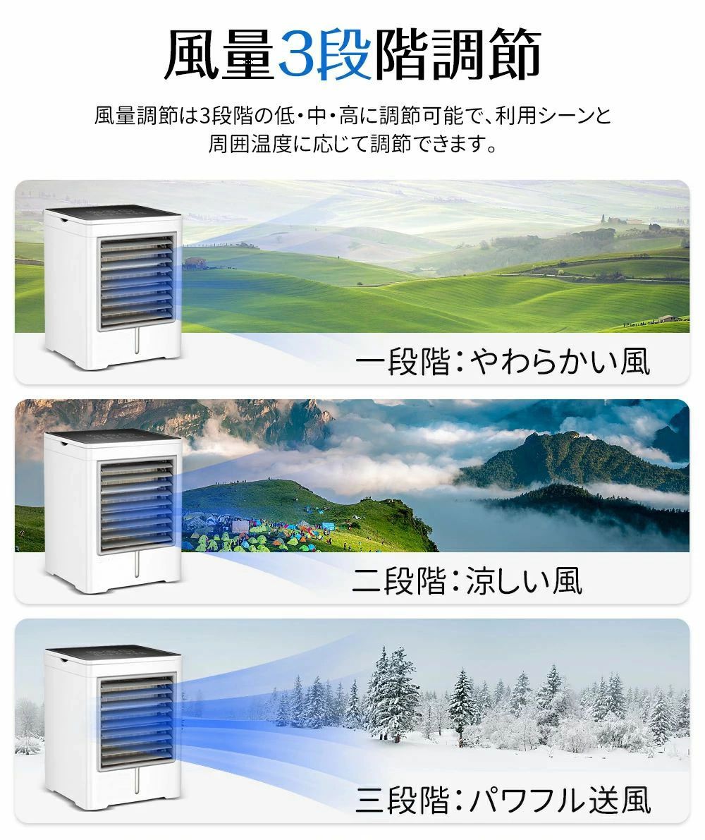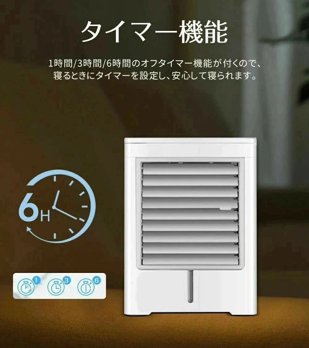 【多機能冷風扇】最新版 470ml大容量冷風機です!冷却・加湿・空気清浄・アロマの四つ機能を搭載暖かい空気を取り込みタンクの水で冷やされた空気を送風。本体内部のフィルタを通すことで空気を清浄に。(1)冷風扇:暑い夏を涼しく快適に(2)加湿器:本体に水を入れて電源を入れるだけ! 水が蒸発する際の気化熱を利用して周囲空気を加湿し、お部屋の乾燥、お肌と喉のトラブルを防止。(3)アロマ機能:水タンクにお水と一緒にアロマを追加することでいい香りを楽しみながらリラックス空間を演出することもできます。一台4役で、様々な効果をもらえます。【タイマー機能】1h&3h&6hタイマ機能、寝る時にタイマーを設定し、安心して寝られます。 連続運転だけでなく、1-6時間まで設定できるオフタイマー機能付きます。12時間自動オフ機能も付きです。 該当商品は日本国内の電気安全法(PSE)適合性検証済みで、ご安心に利用いただけます。【風量3段階切替&氷いれ可能】強・中・弱風量切り替えができます。近距離での使用に適した小型冷風機で氷も入れるできて、水だけ入れる冷風機より、さらに涼しさを体感!エアコンの様な冷たい風ではなく、気持ちがよい程度の風なので、子ども、女性やお年寄りなど、冷えに敏感な方におすすめします。(ご注意:必ず純水を使用してください。)【コンパクト&USB給電冷風機】コンパクトと小型で場所もあまり取らなくて、携帯便利性と移動便利性が高い卓上冷風機です。空間の節約に!家、オフィス、寝室など様々な場合が利用できます。 付属のUSBケーブルをコンセント、PC、アダプターなどに挿して手軽く冷風機扇に給電しながら使用できますので屋外でも使用できます。【使用方法】タッチパネルを搭載で軽く触れるだけでスマートに操作することができます。タッチパネル式を採用し、反応も素早く操作が簡単です。使い勝手が抜群です。