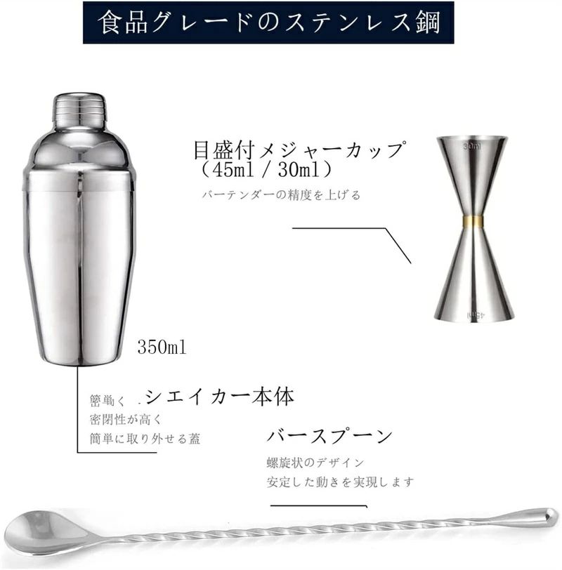 【完璧なセット】必須のカクテルシェーカーアクセサリー3個、350mlカクテルシェーカーx 1、30ml / 45mlジガーカップx 1、バースプーン×1。プロのバーテンダーでも自家製のファンでも、最も基本的で不可欠なバーテンダーツールセットです。 【カクテルシェーカー】350mlの大容量で、フタはしっかりと設計されており、振っても漏れません。家でカクテルを楽しむことができます。 【ジガーカップ】小さなヘッドカップは30mlで満たされ、内部の目盛りは10ml、20mlです;大きなカップは45mlで満たされ、内部スケールは15ml、30mlです。明確で正確な目盛,正確な測定が保証されます。滑らかで手を切ることはありません。初心者でも快適に使えます。 【高品質のステンレス製】防錆ジガーとバースプーンは高品質の18/8ステンレス鋼でできており。健康、無毒、耐久性、無臭の食品グレードの素材を採用しています。長年の商用使用に耐えることができます。そしてそれは食器洗い機できれいにすることができます。
