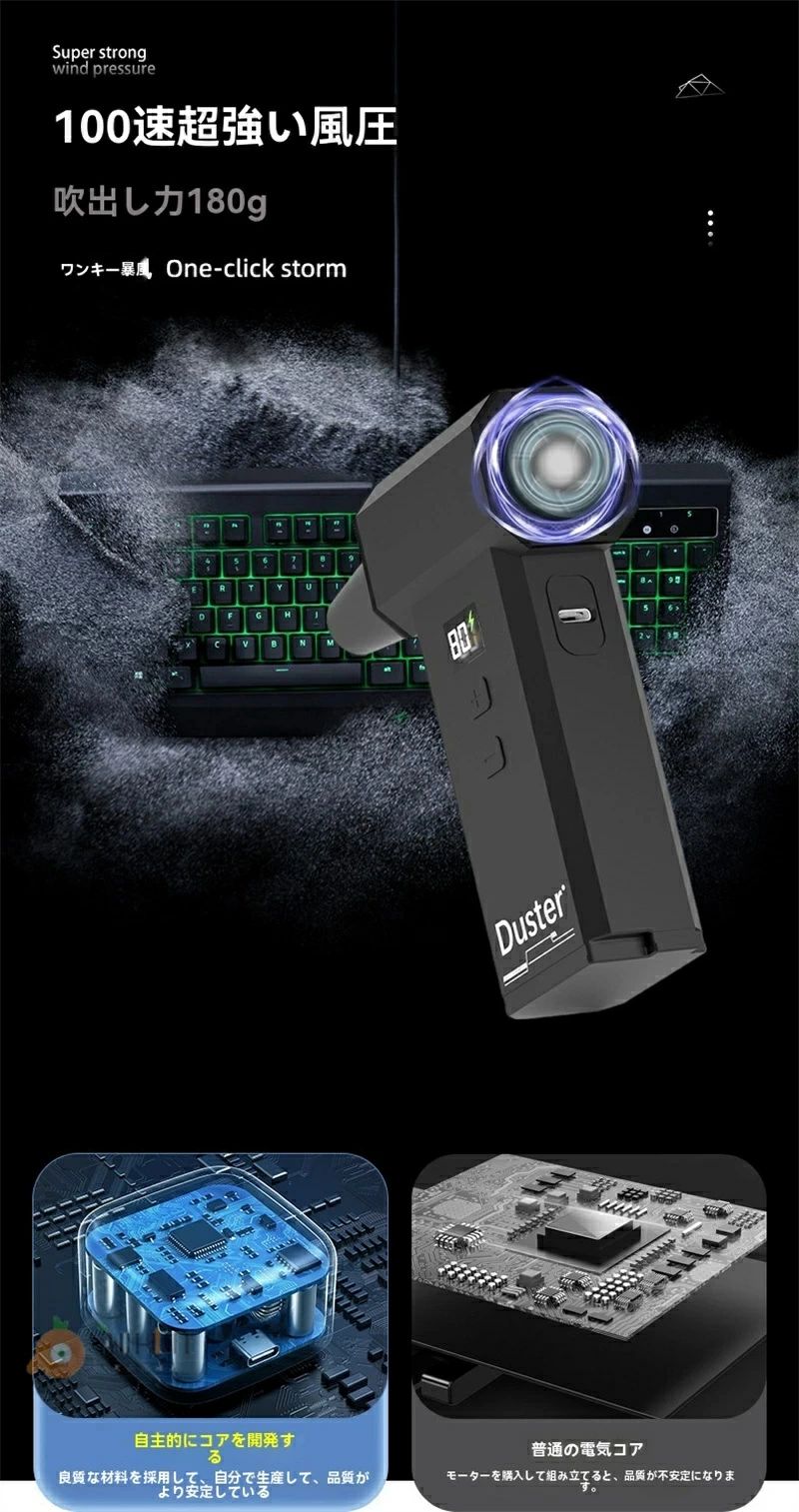 【大風量&強力吸引】 200Wのハイパワーで、強力な風を吹き出すだけでなく、9000Paの吸引力で細かいゴミやホコリも完全に吸い取ります。吹き吸い両用の機能で、掃除やメンテナンス作業を効率的に行えます。 【8000mAh大容量バッテリー&超長寿命】 8000mAhの大容量バッテリーを搭載し、最大120分の超長時間稼働が可能。3.5時間の高速充電で、すぐに使用できるため、仕事や旅行にも便利です。 【100段階風速調整&多機能設計】 100段階の風速調整が可能で、状況に応じた風量を自由に選べます。車の掃除,バーベキュー助火,パソコン,カメラ機器の掃除にも活躍します。 【安全設計&多重保護機能】 過電圧、過充電、過流、過放電、温度、バッテリー保護などの多重保護機能を備えており、安全に使用できます。使用中も安心して長時間の作業が可能です。 【便利なアクセサリー&洗えるフィルター】 本体、吸塵毛ブラシ、集塵容器、吹管、扁嘴吹管、充電ケーブル、収納バッグなど、豊富なアクセサリーが揃っています。フィルターは洗浄可能で、清潔に保ちながら長期間使用できます。