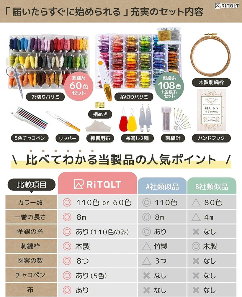 「初心者にやさしい刺繍糸セット」「これから刺繍を始めてみたいけど、糸や道具を揃えるのが面倒…」という方向けの刺繍糸と刺繍道具のセットです。刺繍をする上で必要なものはすべて揃っています。「ハンドブック付き」わかりやすいステッチ図解と、かわいい図案が掲載されたハンドブックをいっしょにお届けします。お花やどうぶつたちをモチーフとした図案は8パターン。12cmの刺繍枠にぴったりなサイズです。付属の練習用布でさっそく刺繍を始めてみましょう。「刺繍枠をリニューアル」《研磨加工済み》丸みを帯びたエッジは手にやさしく、刺繍生地を傷めません。《12cmサイズ》手によくなじみ、使いやすいサイズ感です。《ブナ木材採用》曲げ加工に強く、高い耐久性を持つ木材です。「豊富なカラー」美しいグラデーションを描く豊富なカラーで、創作意欲が湧くこと間違いなし。整然と並んだ刺繍糸は、目的の色をすぐに取り出せます。刺繍糸は管理しやすいカード巻きタイプ。「商品仕様」*セット内容:刺繍糸(60色/108色)、刺繍枠、糸切りばさみ、刺繍針、糸通し、リッパー、指ぬき、チャコペン5色、ハンドブック、布 *カラー:60色/108色 *重量:《60色》350g/《108色》750g *ブランド:RITALT(登録 第6356488号)は、安心・安全の日本ブランドです。*チャコペンは水で消えるタイプになります。熱で定着する可能性がありますので、アイロンをかけたり、ひなたに置いておく等はしないようご注意ください。※ 他ネットショップでも併売しているため、ご注文後に在庫切れとなる場合があります。予めご了承ください。※ 品薄または希少等の理由により、参考価格よりも高い価格で販売されている場合があります。ご注文の際には必ず販売価格をご確認ください。※ 沖縄県、離島または一部地域の場合、別途送料の負担をお願いする場合があります。予めご了承ください。※ お使いのモニタにより写真の色が実際の商品の色と異なる場合や、イメージに差異が生じることがあります。予めご了承ください。※ 商品の詳細(カラー・数量・サイズ 等)については、ページ内の商品説明をご確認のうえ、ご注文ください。※ モバイル版・スマホ版ページでは、お使いの端末によっては一部の情報が表示されないことがあります。すべての記載情報をご確認するには、PC版ページをご覧ください。*刺繍をはじめてみたい方におすすめの刺繍セット 刺繍をはじめてみたいけど、糸や道具をそろえるのが面倒・・と思っている方におすすめなのが、RITALT刺繍セット。刺繍糸(60色/108色)と、12cm刺繍枠、ハサミなど、刺繍に必要な道具をすべてセットにしました。このセットがあればすぐに刺繍がはじめられます。刺繍糸は、60色セット、108色セットの2種類。豊富で美しいカラーが、専用ケースに並んでいますので、創作意欲がわくこと間違いなし。あなただけの作品作りを楽しんでください。