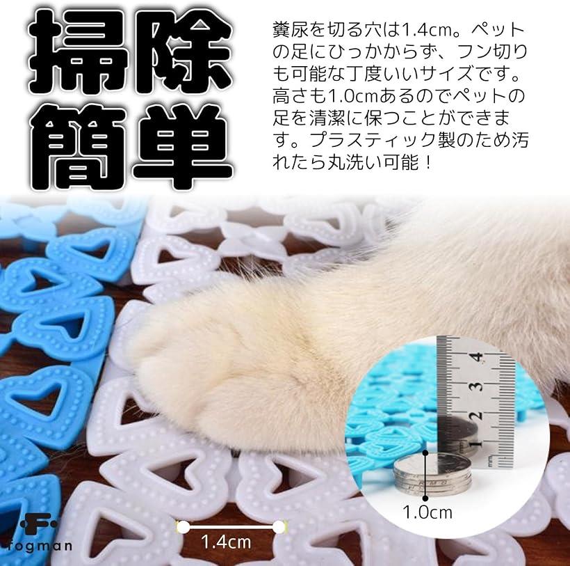 「掃除簡単」プラスティック製のため汚れたら丸洗い可能。糞尿を切る穴は1.4cm。ペットの足にひっかからず、フン切りも可能な丁度いいサイズです。高さも1.0cmあるのでペットの足を清潔に保つことができます。「裁断可能」ハサミでカンタンに切ることができます。残りスペースが狭く小さいサイズでも裏面の雄雌構造でお互いをしっかり固定するため、どんなゲージでも段差が出来たりズレたりすることがなく、ぴったりに設置できます。「組合わせ自由」豊富な10色をご用意しましたので、お好みのカラーにカスタムすることができます。同系色の濃淡、あるいは明暗の二色を組み合わせた配色もお洒落ですし、カラフルにしてもかわいいです。「用途多彩」水を透して床から水を切り離す機能と滑り防止機能を兼ね備えているので、小動物用としてでなく、バスマットやキッチンマット、お手洗い、洗面台など水回りでも大活躍します。アイデア次第で様々な用途で使用することができます。「商品詳細」複数組み合わせても表面の模様がぴったりとつながり綺麗にフラットに仕上がります。裏面はマルチポイントで支持されているので人が乗っても沈み込みがなく頑丈で耐久性抜群です。適度な柔軟性があるため足の負担を和らげ怪我の予防にもなります。「サイズ/セット数」本体サイズ:30 x 20 x 1cm/穴のサイズ:1.4cm/セット:4枚/素材:PVC「カラー」ホワイト、パープル、グレー、ターコイズブルー、オレンジ、チェリーピンク、グリーン、スカイブルー、ピンク、ライトパープル商標登録第6354569号※ 他ネットショップでも併売しているため、ご注文後に在庫切れとなる場合があります。予めご了承ください。※ 品薄または希少等の理由により、参考価格よりも高い価格で販売されている場合があります。ご注文の際には必ず販売価格をご確認ください。※ 沖縄県、離島または一部地域の場合、別途送料の負担をお願いする場合があります。予めご了承ください。※ お使いのモニタにより写真の色が実際の商品の色と異なる場合や、イメージに差異が生じることがあります。予めご了承ください。※ 商品の詳細(カラー・数量・サイズ 等)については、ページ内の商品説明をご確認のうえ、ご注文ください。※ モバイル版・スマホ版ページでは、お使いの端末によっては一部の情報が表示されないことがあります。すべての記載情報をご確認するには、PC版ページをご覧ください。