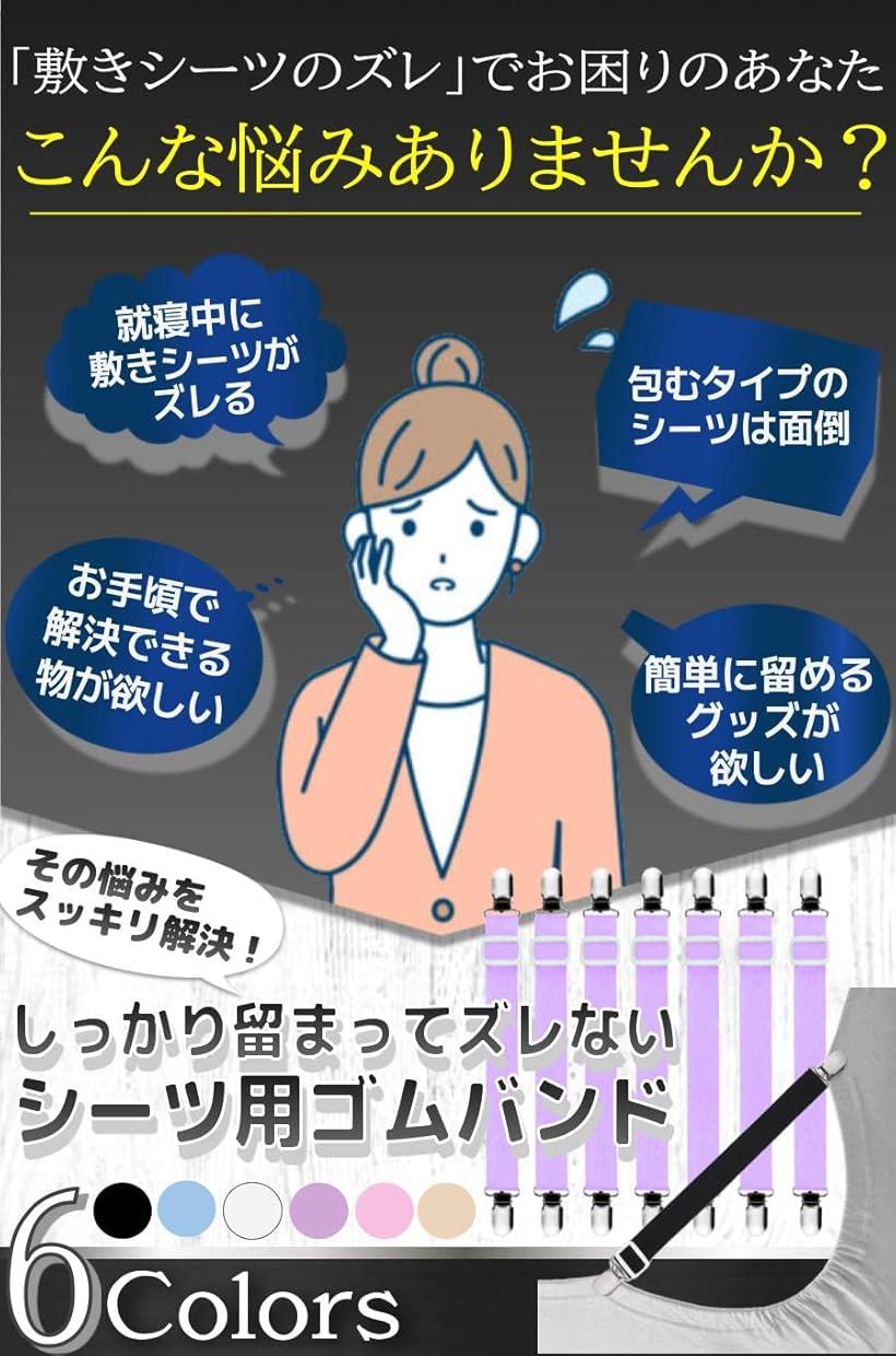 「シーツ用ゴムバンド」 マットレスや敷布団のシーツが就寝中にズレて困っていませんか?そんな時はこのゴムバンドを四隅に装着。弾力性の高いゴムとしっかり食い込むクリップが、シーツのズレを防ぎます。「プラスチック製の爪」 クリップは耐久性の高いステンレス製。内部の爪にはプラスチックを使用しているため、しっかり食い込んでも生地を傷めません。「18~60cmまで対応」 弾力性が高いナイロンゴムがよく伸びてしっかりとフィット。バックルで長さの調節も可能なので、シーツだけでなくソファカバーや敷パッドの固定など、さまざまな用途に使えます。「背面中央にも使える」 お得な8本セットだから、背面中央部に装着することで、よりピンと張ったシーツ感に仕上げることができます。四隅のみなら家族2人分にも使えます。「商品特徴」 しっかり留まる:プラスチック製の爪が生地を傷めずしっかりホールド 弾力性が高い:高弾性ナイロンゴムがよく伸びてフィット お得な8本セット:寝具2つ分の4隅に使える8本セット 豊富なカラー展開:6色から好きな色を選べる「商品詳細」 素材:弾性ナイロンゴム・ステンレス鋼 サイズ:2.5 x 18 cm セット:8本商標登録第6354569号※ 他ネットショップでも併売しているため、ご注文後に在庫切れとなる場合があります。予めご了承ください。※ 品薄または希少等の理由により、参考価格よりも高い価格で販売されている場合があります。ご注文の際には必ず販売価格をご確認ください。※ 沖縄県、離島または一部地域の場合、別途送料の負担をお願いする場合があります。予めご了承ください。※ お使いのモニタにより写真の色が実際の商品の色と異なる場合や、イメージに差異が生じることがあります。予めご了承ください。※ 商品の詳細(カラー・数量・サイズ 等)については、ページ内の商品説明をご確認のうえ、ご注文ください。※ モバイル版・スマホ版ページでは、お使いの端末によっては一部の情報が表示されないことがあります。すべての記載情報をご確認するには、PC版ページをご覧ください。