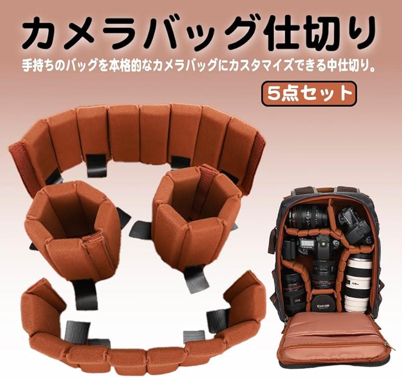 手持ちのバッグを本格的なカメラバッグにカスタマイズできる中仕切り。大切なカメラ本体やレンズがバッグ内で擦れて傷が付く事を防いでくれます。滑らかな手触りで大切なレンズやカメラを傷つけない起毛素材。厚さ12mmのクッションが衝撃をしっかり吸収するので、登山や釣り、旅先でのアクティブな撮影現場へ持ち込む際も安心です。サイズの違う5点セット。あらゆるバッグやレンズに対応可能です。レンズの取り出しもスムーズでスマートなレンズ交換に一役買います。スタイリッシュなレンガ色で見た目もかっこよく、撮影のテンションが上がります。手持ちのバッグやリュックを気軽にカメラケースにカスタマイズできます。カメラ好きの方へプレゼントとしても喜ばれます。「素材」ポリエステル「カラー」ブラウン「内容品各サイズ」A(シングル)12cmx14cm、B(三つ折り)17cmx12cm、C(ジャバラ・ショート)26cmx12.3cm、D(ジャバラ・ロング)31cmx12.3cm、D(ベルト)20.5cmx2.5cm※ 他ネットショップでも併売しているため、ご注文後に在庫切れとなる場合があります。予めご了承ください。※ 品薄または希少等の理由により、参考価格よりも高い価格で販売されている場合があります。ご注文の際には必ず販売価格をご確認ください。※ 沖縄県、離島または一部地域の場合、別途送料の負担をお願いする場合があります。予めご了承ください。※ お使いのモニタにより写真の色が実際の商品の色と異なる場合や、イメージに差異が生じることがあります。予めご了承ください。※ 商品の詳細(カラー・数量・サイズ 等)については、ページ内の商品説明をご確認のうえ、ご注文ください。※ モバイル版・スマホ版ページでは、お使いの端末によっては一部の情報が表示されないことがあります。すべての記載情報をご確認するには、PC版ページをご覧ください。