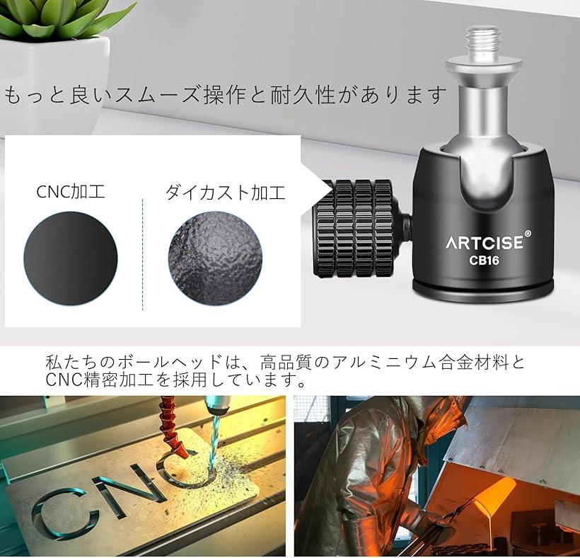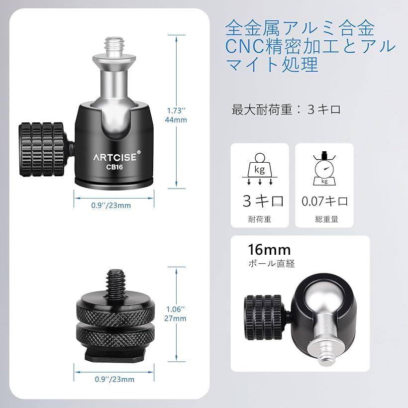 互換品 小型 ボール 自由雲台 ホットシューマウント付き 1/4インチネジ 軽量 アルミ合金 ミニ 三脚ヘッド 360度回転可能 パノラマ カメラ雲台 ライトスタンドDSLRカメラ ビデオカメラ等に対応 耐荷重3キロ