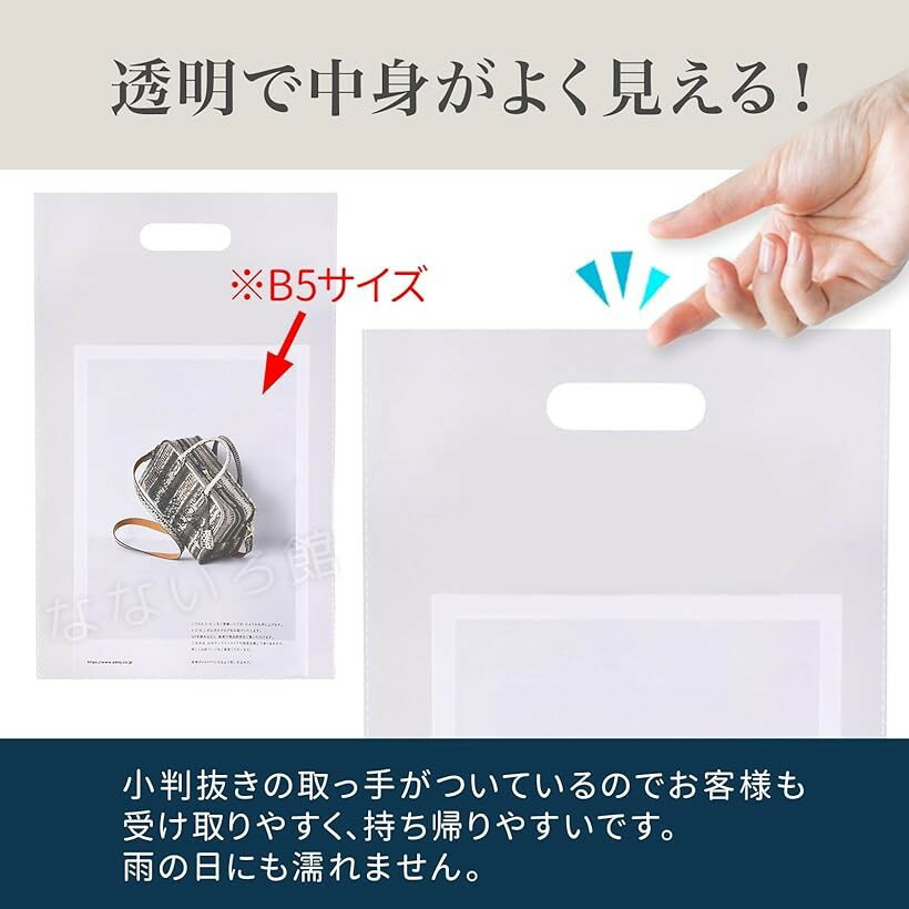 A4サイズの資料やパンフレット、記念品などを入れる透明の手提げ袋100枚セットです。透明で中身がよく見えます。小判抜きの取っ手がついているのでお客様も受け取りやすく、持ち帰りやすいです。雨の日にも濡れません。A4クリアホルダーも入る使いやすいサイズです。サンプル品、ノベルティ、ポケットティッシュ、ボールペン、名刺なども入れられます。イベント・説明会・セミナーなどでの配布に最適。営業、宣伝、展示会、説明会、セミナー、イベント時の販促にご利用ください。「サイズ」縦38cm 横23.3cm 厚さ0.04mm *マチはありません 「素材」ポリプロピレン※ 他ネットショップでも併売しているため、ご注文後に在庫切れとなる場合があります。予めご了承ください。※ 品薄または希少等の理由により、参考価格よりも高い価格で販売されている場合があります。ご注文の際には必ず販売価格をご確認ください。※ 沖縄県、離島または一部地域の場合、別途送料の負担をお願いする場合があります。予めご了承ください。※ お使いのモニタにより写真の色が実際の商品の色と異なる場合や、イメージに差異が生じることがあります。予めご了承ください。※ 商品の詳細(カラー・数量・サイズ 等)については、ページ内の商品説明をご確認のうえ、ご注文ください。※ モバイル版・スマホ版ページでは、お使いの端末によっては一部の情報が表示されないことがあります。すべての記載情報をご確認するには、PC版ページをご覧ください。