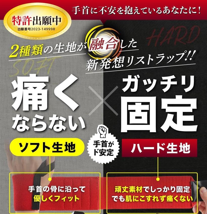 「特許出願中の2種類の生地を使った新発想リストラップ」ソフト生地xハード生地をかけ合わせた今までにないリストラップ「ハード生地でしっかり固定」巻き付け2週目で直接肌に触れないから固い生地でも痛くならず、手首をしっかり固定してガンガン追い込める「ソフト生地で手首にぴったりフィット」手首に触れる巻き付け1週目はソフト生地だから擦れて痛くならない。手首にフィットするからずれにくく、トレーニングに集中できる「現役フィジーカー監修」さらに開発スタッフもトレーニーで、実際に使う人の悩みから生まれた新タイプの商品です。繋ぎ合わせ部分の縫製方法など何度も試行錯誤を重ね、実際のトレーニングで使用しテストし完成に至りました。素材:ポリエステル、ゴムラテックス*ラテックスアレルギー反応やアナフィラキシーショックを起こした方はご購入をお控えください。※ 他ネットショップでも併売しているため、ご注文後に在庫切れとなる場合があります。予めご了承ください。※ 品薄または希少等の理由により、参考価格よりも高い価格で販売されている場合があります。ご注文の際には必ず販売価格をご確認ください。※ 沖縄県、離島または一部地域の場合、別途送料の負担をお願いする場合があります。予めご了承ください。※ お使いのモニタにより写真の色が実際の商品の色と異なる場合や、イメージに差異が生じることがあります。予めご了承ください。※ 商品の詳細(カラー・数量・サイズ 等)については、ページ内の商品説明をご確認のうえ、ご注文ください。※ モバイル版・スマホ版ページでは、お使いの端末によっては一部の情報が表示されないことがあります。すべての記載情報をご確認するには、PC版ページをご覧ください。