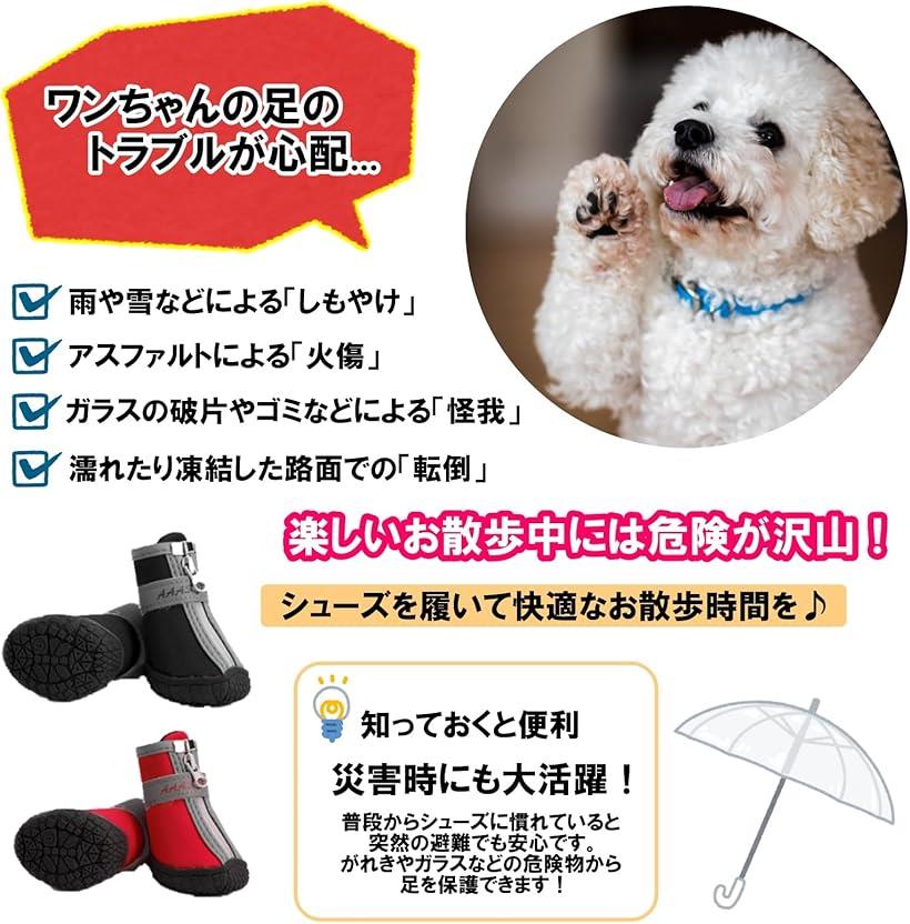 ファスナー付きで、開口部が広く、嫌がるワンちゃんにもサッと履かせやすい。防水設計のペット用シューズです。テープも付いているので、更に固定でき、しっかりとフィットして歩きやすい。ソフトなウェットスーツ生地で作られているので、履き心地が良く、足への負担も軽減。軽量素材を採用し、快適な動きをサポートしてくれます。ワンちゃんの体温調整も妨げません。雨の日も雪の日も大活躍。通気性にも優れているのでワンちゃんも快適に着用できます。反射板が付いているので、夜間のお散歩も安心。災害時にもとても有効です。普段からシューズに慣れていると、突然の避難時でも安心です。ガラスの破片やゴミなどによる怪我からワンちゃんを守ってくれます。汚れたら手洗いすることができ、清潔に保てます。ゴム製のアウトソールは弾力性と耐摩擦性が高く、暑い日のマンホールやアスファルトでの火傷、寒い日の肉球の凍傷、雨の日の汚れなどから大切なワンちゃんの足を守ってくれます。「カラー:ブラック、レッド」「サイズ:1#(XXS)、2#(XS)、3#(S)、4#(M)、5#(L)」*サイズ表を参考に足のサイズを測ってのご購入をお願い致します。※ 他ネットショップでも併売しているため、ご注文後に在庫切れとなる場合があります。予めご了承ください。※ 品薄または希少等の理由により、参考価格よりも高い価格で販売されている場合があります。ご注文の際には必ず販売価格をご確認ください。※ 沖縄県、離島または一部地域の場合、別途送料の負担をお願いする場合があります。予めご了承ください。※ お使いのモニタにより写真の色が実際の商品の色と異なる場合や、イメージに差異が生じることがあります。予めご了承ください。※ 商品の詳細(カラー・数量・サイズ 等)については、ページ内の商品説明をご確認のうえ、ご注文ください。※ モバイル版・スマホ版ページでは、お使いの端末によっては一部の情報が表示されないことがあります。すべての記載情報をご確認するには、PC版ページをご覧ください。