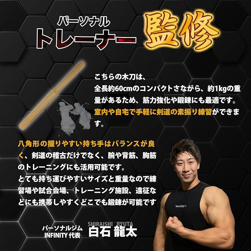 室内や自宅で手軽に剣道の素振り練習:剣道の練習に役立つ室内素振り用の短い木刀です。室内や狭いスペースでも思い切り素振りできる形状で、初心者の方から上級者の方まで幅広くお使いいただけます。短いのに重量があり鍛錬に役立つ:全長が約60cmで、バランスの良い八角形に切り出されたシンプルなデザインです。しっかり握りやすい持ち手で、約1kgの重量があるので程よい負荷がかるので、鍛錬や筋トレに役立ちます。様々なトレーニング用に活用可能:剣道だけでなく、腕や背筋、胸筋などの筋力を鍛える、野球やソフトボールのトレーニング用としても幅広くご活用いただいております。室内でも扱いやすい絶妙なサイズ感なので、お部屋でも素振りの練習ができます。選べる2タイプ:ベーシックと革柄の2種類を用意しています。グリップテープなどを使用する場合はベーシックタイプを、すぐに使いたい場合は革柄タイプがおススメです。全長:約60cm 刀直径:約5.6cm 柄直径:約3.7cm 重量:約1kg 素材:ケヤキ *天然素材の為、重量や色味、木目の出方に個体差があります。※ 他ネットショップでも併売しているため、ご注文後に在庫切れとなる場合があります。予めご了承ください。※ 品薄または希少等の理由により、参考価格よりも高い価格で販売されている場合があります。ご注文の際には必ず販売価格をご確認ください。※ 沖縄県、離島または一部地域の場合、別途送料の負担をお願いする場合があります。予めご了承ください。※ お使いのモニタにより写真の色が実際の商品の色と異なる場合や、イメージに差異が生じることがあります。予めご了承ください。※ 商品の詳細(カラー・数量・サイズ 等)については、ページ内の商品説明をご確認のうえ、ご注文ください。※ モバイル版・スマホ版ページでは、お使いの端末によっては一部の情報が表示されないことがあります。すべての記載情報をご確認するには、PC版ページをご覧ください。