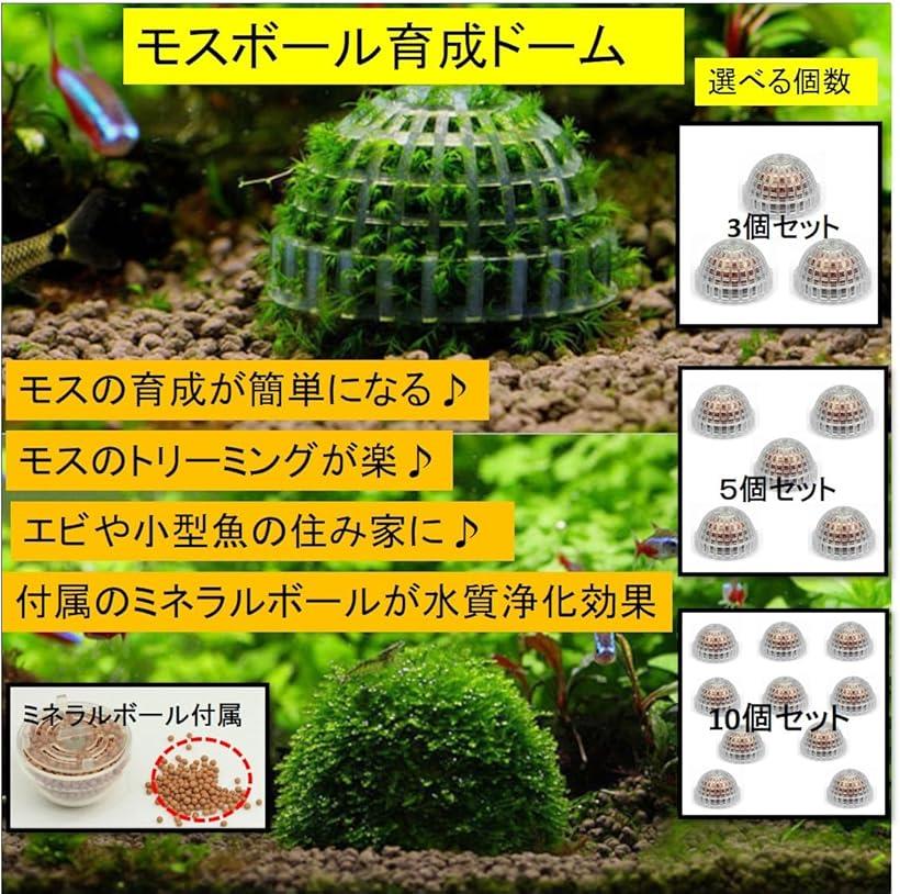 「選べる個数 3個 5個 10個」モスボール モスドーム 。 ウイローモス 水草 モス マット 栽培 育成 作成 植物ホルダー 植物栽培 水草レイアウトにどうぞ。「こんな商品」ウイローモスの育成、繁殖、固定にご使用ください。従来は岩や流木に糸を巻き付けて固定しておりましたが本商品は容器にウイローモスを入れるだけで容易に繁殖して増殖していきます。増えてきたらさらに容器に入れていくことで増やす事ができます。数を多くすることでウイローモスのじゅうたんで敷き詰めれば非常に綺麗なレイアウトが完成されます。モスボールは小魚やエビなどの隠れ家や住み家になりレイアウト以外の効果もあります。「安心素材」安心なプラスチック素材を採用しているので水質に影響を与えないので安心してご使用いただけます。「水質浄化機能」付属のミネラルボールは魚やエビに適したミネラルを放出いたします。また、表面がザラザラしているのでバクテリアの住み家にもなり水質の安定を手助けします。「商品サイズ」5cmx3.6cm 素材 プラスチック※ 他ネットショップでも併売しているため、ご注文後に在庫切れとなる場合があります。予めご了承ください。※ 品薄または希少等の理由により、参考価格よりも高い価格で販売されている場合があります。ご注文の際には必ず販売価格をご確認ください。※ 沖縄県、離島または一部地域の場合、別途送料の負担をお願いする場合があります。予めご了承ください。※ お使いのモニタにより写真の色が実際の商品の色と異なる場合や、イメージに差異が生じることがあります。予めご了承ください。※ 商品の詳細(カラー・数量・サイズ 等)については、ページ内の商品説明をご確認のうえ、ご注文ください。※ モバイル版・スマホ版ページでは、お使いの端末によっては一部の情報が表示されないことがあります。すべての記載情報をご確認するには、PC版ページをご覧ください。