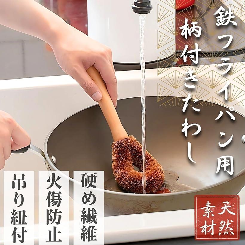 鉄フライパンや鍋、中華鍋、土鍋に最適な「柄付きたわし」が新登場。天然椰棕(ヤシ繊維)とブナ材を使用した柄付きのキッチンブラシで、ココヤシの繊維がしっかりと汚れを落とします。ブラウンカラーの木製束子は自然素材のやさしい使い心地。紐付きで吊るして乾燥・保管も簡単です。主に鉄フライパン用たわしとしてご使用いただけます。他にも土鍋、竹製食器を大切に使いたい方におすすめです。洗剤を使わずに汚れを落とせるので、手や自然にも優しく、木柄の持ち手があるため手が汚れず熱くなりません。こだわりの道具でフライパンや食器を丁寧に育てたい方にぴったりのタワシです。木柄の持ち手は長く、熱湯使用時も安心。手作りならではのユーズド風な質感も魅力。自然素材(椰棕・木)使用で、ココナッツファイバーのしなやかさと耐久性も抜群です。フライパンや中華鍋の使用後は、洗剤を使わず熱湯でサッと洗うのが鉄フライパンの基本。この柄付きブラシなら手が汚れず火傷も防げます。吊り紐で乾燥もラクラク。全長は約25cm、たわし部分は約9cmで、鉄フライパンや鍋の洗浄に最適なサイズ感。天然素材のココナッツファイバー(ヤシ繊維)を使用し、木柄には丈夫なブナ材を採用。カラーは温かみあるブラウン。使用前は水洗いを推奨します。洗剤不要で、自然なキッチン掃除が叶うタワシです。※ 他ネットショップでも併売しているため、ご注文後に在庫切れとなる場合があります。予めご了承ください。※ 品薄または希少等の理由により、参考価格よりも高い価格で販売されている場合があります。ご注文の際には必ず販売価格をご確認ください。※ 沖縄県、離島または一部地域の場合、別途送料の負担をお願いする場合があります。予めご了承ください。※ お使いのモニタにより写真の色が実際の商品の色と異なる場合や、イメージに差異が生じることがあります。予めご了承ください。※ 商品の詳細(カラー・数量・サイズ 等)については、ページ内の商品説明をご確認のうえ、ご注文ください。※ モバイル版・スマホ版ページでは、お使いの端末によっては一部の情報が表示されないことがあります。すべての記載情報をご確認するには、PC版ページをご覧ください。