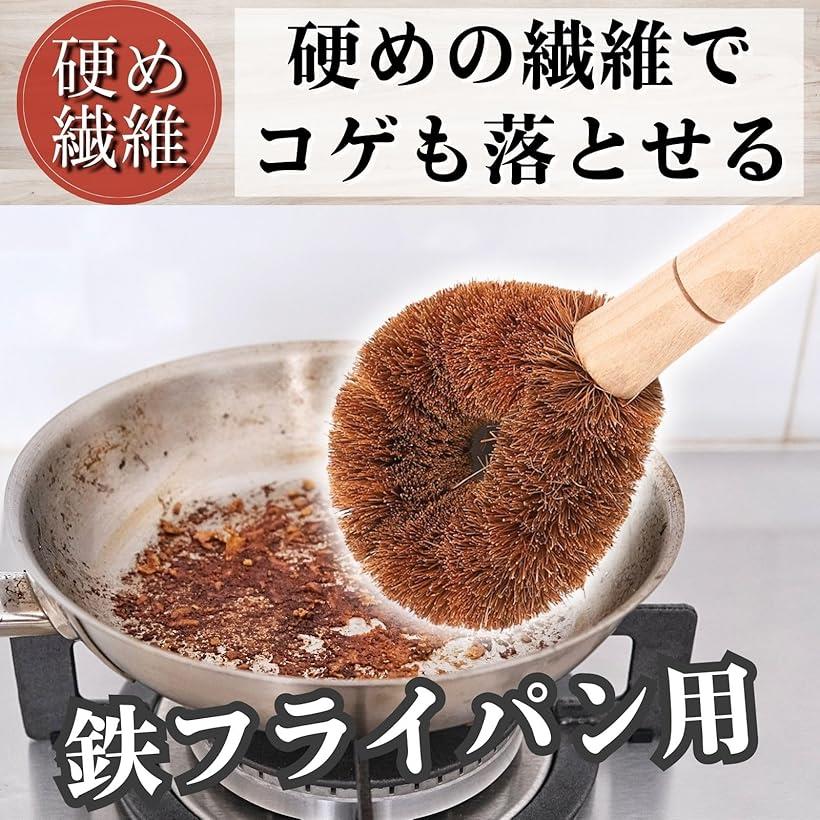 鉄フライパン用たわし 柄付きたわし ココナッツファイバー 椰棕 天然素材 吊り下げ紐付き ブラウン