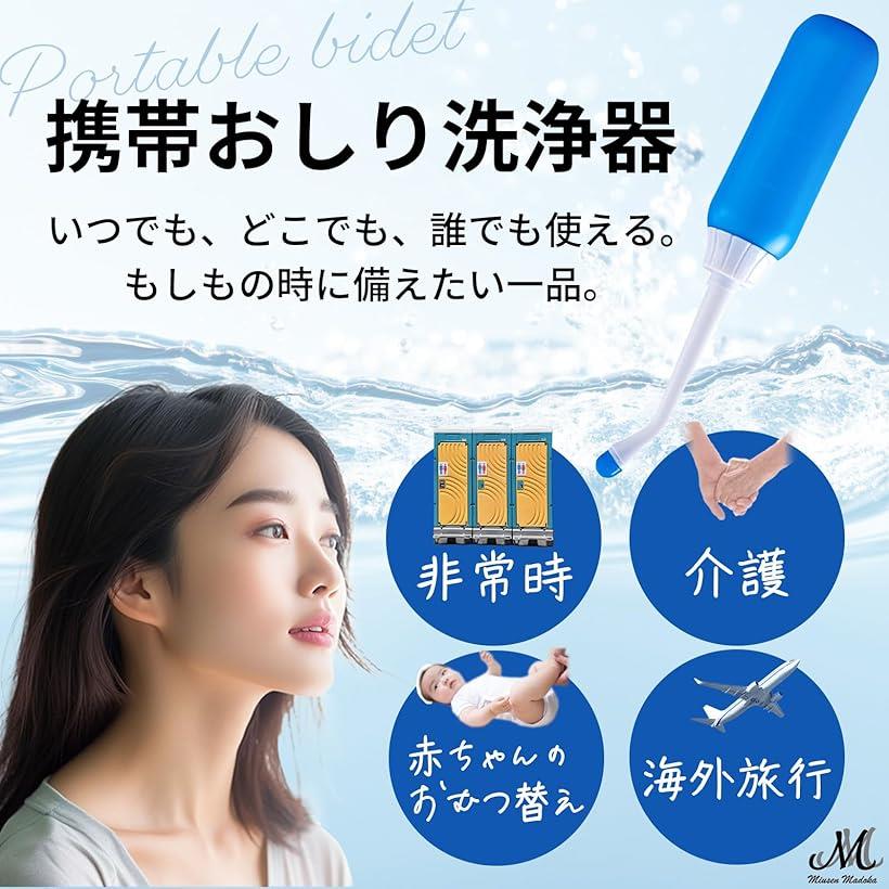 「どこでもおしり洗浄」携帯小物は小型軽量がマストです。漏れ防止設計 外出時、防災グッズとしても、自分専用の携帯型おしり洗浄器をお求めの方が増えています。特に海外旅行には必携旅グッズです。海外旅行ではホテルに温水便座の設備の有無をご確認することをお勧めします。外国では温水便座設備のホテルを探すのが難しいです。「軽く押してポイントに噴射できる」水漏れしない設計,2種類ノズル先端口を用意。充分な水圧と小型の400mLの量と軽さが特徴の携帯温水洗浄便座です。(1)お尻に当てやすい設計角度は、指先に乗せて片手で押し出します。(2)直進噴射口で、赤ちゃんのオムツ替えや介護の時にもぬるま湯で洗浄してやってください。「不快解決」お出掛けやご旅行の際に、特に海外旅行に必須小物に加えて下さい。ビデとしてもご利用ください。赤ちゃんのおむつかぶれにシャワーはいかがでしょうか。小さな軽量400mlボトル。指先でそっと押せば、ご自分専用の携帯 おしり洗浄器です。「電動タイプと比較して」充電不要、電池不要。海外では電源ソケット形状が異なりますが、ご心配不要です。本品は電動と比べ軽量です。ご旅行用に軽量携帯型おしり洗浄器をお勧めします。携帯温水洗浄便座です。故障修理も電池交換なども無用な携帯温水洗浄便座です。ご旅行に最適な小型で軽量です。水量も400mlで指先で持てるほどの軽量です。収納時わずか約70グラムで防水携帯収納袋付です。「ご使用上の注意点 サポート」温水で洗う場合は、40度以下のお湯を使用してください。容器は90度までの耐熱性があります。旅行用です、水を入れたまま携帯するのはお止めください。日本語説明書付きです。※ 他ネットショップでも併売しているため、ご注文後に在庫切れとなる場合があります。予めご了承ください。※ 品薄または希少等の理由により、参考価格よりも高い価格で販売されている場合があります。ご注文の際には必ず販売価格をご確認ください。※ 沖縄県、離島または一部地域の場合、別途送料の負担をお願いする場合があります。予めご了承ください。※ お使いのモニタにより写真の色が実際の商品の色と異なる場合や、イメージに差異が生じることがあります。予めご了承ください。※ 商品の詳細(カラー・数量・サイズ 等)については、ページ内の商品説明をご確認のうえ、ご注文ください。※ モバイル版・スマホ版ページでは、お使いの端末によっては一部の情報が表示されないことがあります。すべての記載情報をご確認するには、PC版ページをご覧ください。