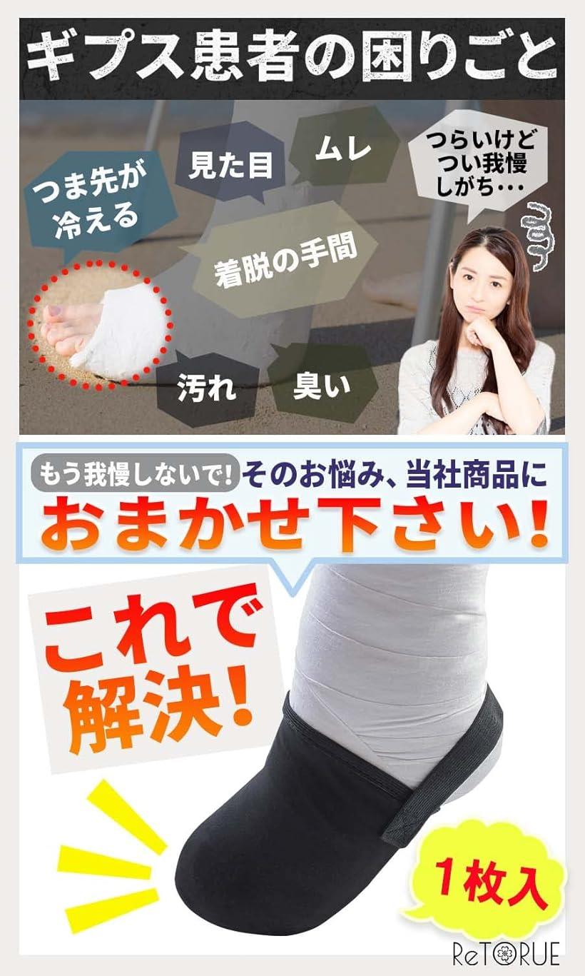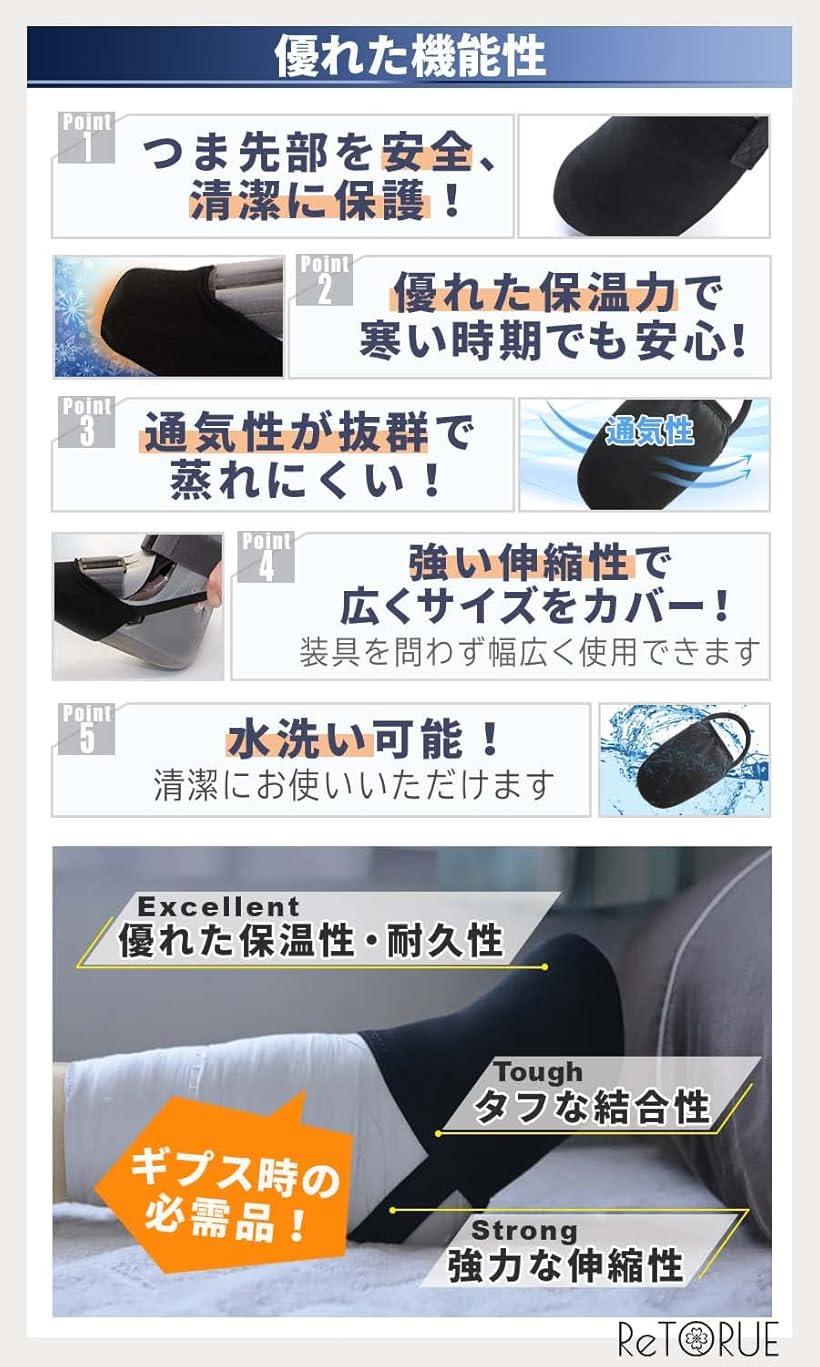 「ギプス患者の困りごと」・冷え・汚れ・におい・蒸れ・着脱の手間・見た目「困ったこと・つらいこと」は我慢しがちではありませんか?「ギプス時の必需品。優れた機能性」・つま先部を安全、清潔に保護。・優れた保温力で寒い時期でも安心。・通気性が抜群なので蒸れにくい。・水洗い可能。いつも清潔にお使いいただけます。・強い伸縮性で広くサイズをカバー。ギプス固定、ヒールギプス固定、プロテクター、ギプスシューズ、サポーター等、様々な装具・いろいろな場面に幅広く使用できます。「もう我慢しないで。そのお悩み、おまかせ下さい。」ご使用いただけば全て解決。「高品質グラスファイバー採用」ガラス繊維から作られる高い保温性と強い耐久性をあわせもつ劣化しにくい高品質の生地です。長期使用も安心。「サイズ」開口部12cm、バンド部分7cm(強伸縮で約2倍の伸長が可能)、つま先部分16cm「オールシーズン活用可能」・天候や季節に左右されず通年使用できます・夏場でも冷える冷房対策、ちょっとした寒暖調節にもワンタッチですぐに着脱できます。※ 他ネットショップでも併売しているため、ご注文後に在庫切れとなる場合があります。予めご了承ください。※ 品薄または希少等の理由により、参考価格よりも高い価格で販売されている場合があります。ご注文の際には必ず販売価格をご確認ください。※ 沖縄県、離島または一部地域の場合、別途送料の負担をお願いする場合があります。予めご了承ください。※ お使いのモニタにより写真の色が実際の商品の色と異なる場合や、イメージに差異が生じることがあります。予めご了承ください。※ 商品の詳細(カラー・数量・サイズ 等)については、ページ内の商品説明をご確認のうえ、ご注文ください。※ モバイル版・スマホ版ページでは、お使いの端末によっては一部の情報が表示されないことがあります。すべての記載情報をご確認するには、PC版ページをご覧ください。