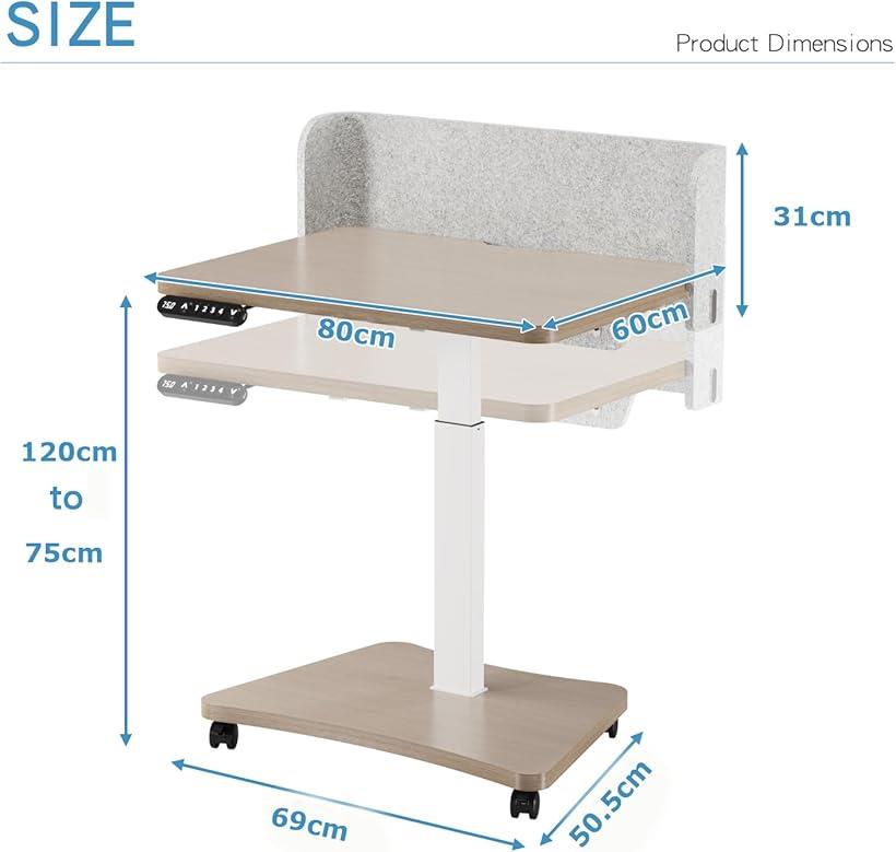 「商品仕様」*天板サイズ:約幅80CMx奥行60CM*本体重量:約24KG *耐荷重60KG *高さ調節範囲:75-120CM*材料:化粧合板、鋼鉄合金材料「電気で高さ調節 」この机は、「⮝・⮟」ボタンを押すと、高さ調整の範囲は75~120cmです。電気スイッチ操作、シンプルで便利。人間工学的な設計に適合しており、人によって身長のニーズに応じて、お希望の高さを調節します。「メモリー機能」このコンピューターテーブルには高さメモリー機能があります。お好きな高さに調節する際、数字ボタンを長押しすると「ピッ」と音が鳴り、高さのメモリー設定が完了します。高さメモリーボタンは4つあり、ワンタッチで使用する高さに調整できます。「移動可能なデザイン」本サイドテーブルには、360度回転可能なキャスターが付いています。必要に応じて好きな位置に移動できます。また、ベッドの脇やソファの下にも簡単に押し込むことができ、場所をとりません。「取り外し可能な間仕切り付き」間仕切り付きは取り外し可能です。勉強やオフィスワークがしやすく、食事用の台としても活躍します。※ 他ネットショップでも併売しているため、ご注文後に在庫切れとなる場合があります。予めご了承ください。※ 品薄または希少等の理由により、参考価格よりも高い価格で販売されている場合があります。ご注文の際には必ず販売価格をご確認ください。※ 沖縄県、離島または一部地域の場合、別途送料の負担をお願いする場合があります。予めご了承ください。※ お使いのモニタにより写真の色が実際の商品の色と異なる場合や、イメージに差異が生じることがあります。予めご了承ください。※ 商品の詳細(カラー・数量・サイズ 等)については、ページ内の商品説明をご確認のうえ、ご注文ください。※ モバイル版・スマホ版ページでは、お使いの端末によっては一部の情報が表示されないことがあります。すべての記載情報をご確認するには、PC版ページをご覧ください。「電気で高さ調節 」この机は、「⮝・⮟」ボタンを押すと、高さ調整の範囲は75~120cmです。電気スイッチ操作、シンプルで便利。人間工学的な設計に適合しており、人によって身長のニーズに応じて、お希望の高さを調節します。「メモリー機能」このコンピューターテーブルには高さメモリー機能があります。お好きな高さに調節する際、数字ボタンを長押しすると「ピッ」と音が鳴り、高さのメモリー設定が完了します。高さメモリーボタンは4つあり、ワンタッチで使用する高さに調整できます。「移動可能なデザイン」本サイドテーブルには、360度回転可能なキャスターが付いています