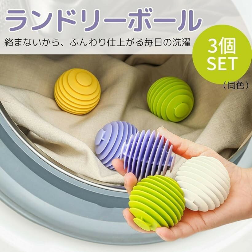 「絡まない。洗浄力アップのランドリーボール」洗濯物の絡みを防ぎ、摩擦でしっかり汚れを落とすランドリーボール3個セット。シワや静電気の発生を抑え、洗濯機・乾燥機で使える便利アイテム。フィン形状で衣類に優しく、ストレスフリーな洗濯を実現します。「投げ込むだけで簡単設置。」洗濯機や乾燥機に投げ込むだけで、もつれや縮みを防ぎ、乾燥時間を短縮。糸くずやシワも軽減し、衣類をふんわり滑らかに仕上げます。ドラム式、縦型、全自動洗濯機に対応し、シンプルで可愛いデザインが洗濯時間を楽しく演出します。「柔らか素材で衣類に優しい」TPR製のやわらかい素材が衣類を傷つけず、引っ掛かりを防ぎます。耐久性・耐摩耗性に優れ、変形しにくいので、繰り返しご使用いただけます。色褪せや臭い移りの心配もなく、長く安心して使えるアイテムです。「商品詳細」セット内容:3個 サイズ:直径5.5cm 材質:TPR(熱可塑性ゴム) * 水量4L~5Lに対し、洗濯ボール3~6個が目安です。洗濯物の素材や数量等でご自由に調整して下さい。*乾燥機でご使用いただけますが、設定温度は75度以下でお願いいたします。75度を超える場合、変形や衣類への影響が生じる可能性がございますので、温度をご確認のうえ、十分ご注意くださいませ。※ 他ネットショップでも併売しているため、ご注文後に在庫切れとなる場合があります。予めご了承ください。※ 品薄または希少等の理由により、参考価格よりも高い価格で販売されている場合があります。ご注文の際には必ず販売価格をご確認ください。※ 沖縄県、離島または一部地域の場合、別途送料の負担をお願いする場合があります。予めご了承ください。※ お使いのモニタにより写真の色が実際の商品の色と異なる場合や、イメージに差異が生じることがあります。予めご了承ください。※ 商品の詳細(カラー・数量・サイズ 等)については、ページ内の商品説明をご確認のうえ、ご注文ください。※ モバイル版・スマホ版ページでは、お使いの端末によっては一部の情報が表示されないことがあります。すべての記載情報をご確認するには、PC版ページをご覧ください。「絡まない。洗浄力アップのランドリーボール」洗濯物の絡みを防ぎ、摩擦でしっかり汚れを落とすランドリーボール3個セット。シワや静電気の発生を抑え、洗濯機・乾燥機で使える便利アイテム。フィン形状で衣類に優しく、ストレスフリーな洗濯を実現します。