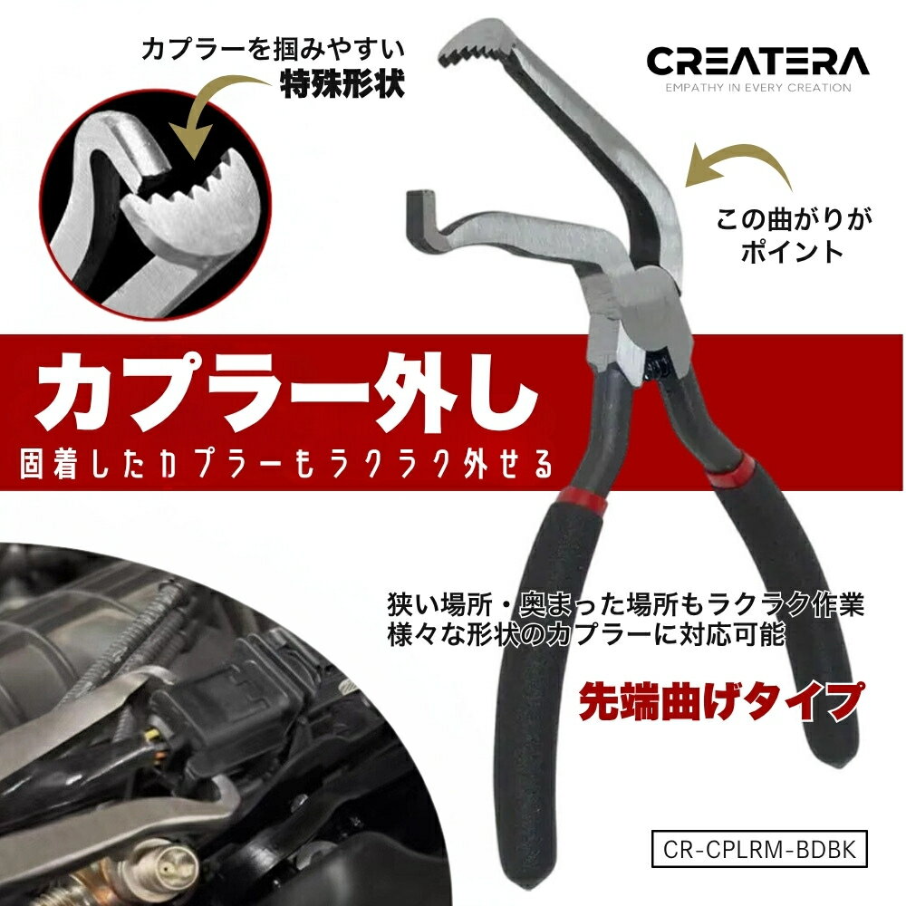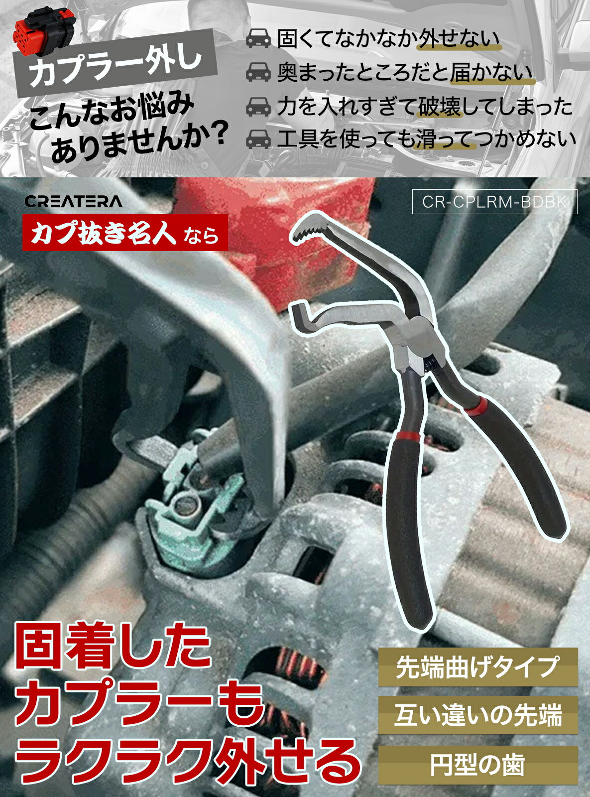 カプラー 外し 工具 曲げタイプ プライヤー 車 バイク用 配線カプラー コネクター外しツール カップリングツール 高炭素鋼製 自動車整備用工具 整備作業をもっと快適に、もっとスムーズに。 ◆ 狭い場所にも届く!曲げタイプ先端設計先端が絶妙に曲がった特殊形状により、狭いエンジンルームや複雑な配線周りでもスムーズにカプラーを取り外せます。まっすぐな工具では届きにくい場所も、ラクにアクセス可能。DIYからプロ整備士まで幅広く活躍します。◆ 狭い場所でも快適作業ストレート形状ながらも絶妙なサイズ設計で、エンジンルームや配線まわりの限られたスペースでもスムーズに作業が可能。角度の調整がしやすく、初心者からプロ整備士まで幅広く活躍します。◆ 高炭素鋼採用で圧倒的な強度と耐久性先端部分には炭素含有量0.6%以上の高炭素鋼を使用。固着したカプラーや外れにくいロックタブ式カプラーも、無理な力を加えずスムーズに外せます。形状が崩れにくく、長期間使用しても性能を維持する頼れる一品です。◆ 滑りにくく、安全・効率的に作業可能専用の挟持構造と滑り止めグリップで、力をかけすぎることなく安全に操作が可能。配線やカプラーを傷つけにくく、手をケガするリスクも軽減。初心者の方にも安心してお使いいただけます。◆ 多用途対応!これ一本で幅広く使えるロックタブ式カプラーはもちろん、エアフローセンサー・燃料インジェクター・イグニッションコイルのほか、外装クリップやナビ・オーディオ配線にも対応。車・バイク問わず、多様な作業に使える万能ツールです。◆ 握りやすく、疲れにくいグリップ手にしっかりフィットする滑り止め加工グリップを採用。ばね付き設計で開閉もスムーズ。長時間の作業でも疲れにくく、快適な使い心地を実現します。プロ品質の「使いやすさ」と「安心感」をぜひご体感ください!整備のストレスを軽減し、作業効率を格段にアップさせるカプラー外しです。 5