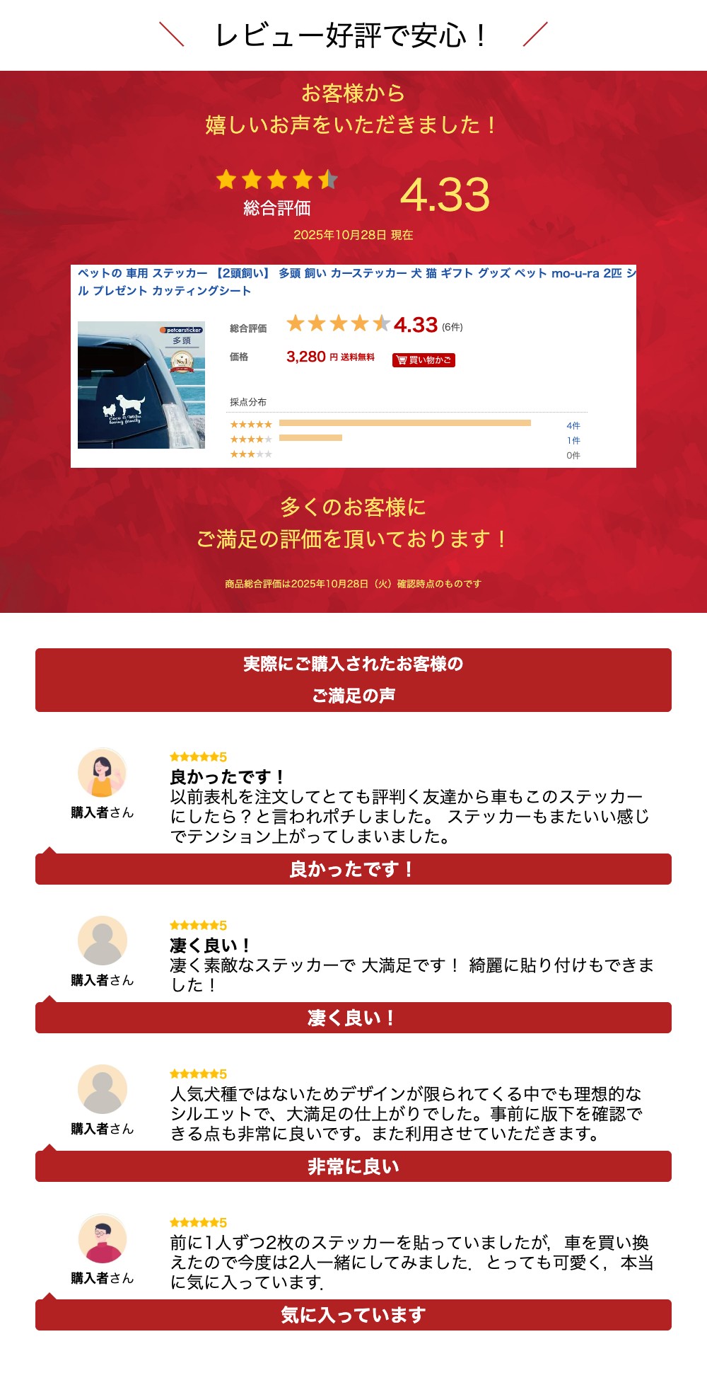 商品情報サイズ多頭サイズ 20cm×30cm※デザインにより、タテヨコのサイズは小さくなる場合があります。色白・黒・青・赤・黄からお選び頂けます。※写真と実物では色合いが変わる場合がります。材質3M社製、屋外用カッティングシート商品説明転写式カッティングシートを切り抜いた商品となります。看板屋さんも使用する屋外用の丈夫なシートを使用しています。※尻尾など接着面が少ない小さなパーツは洗車やワイパーなどでゴシゴシ擦ると剥がれる可能性があります。アーフェンピンシャー アイリッシュウルフハウンド アイリッシュセター アイリッシュソフトコーテッドウィートンテリア 秋田犬 アザワク アフガンハウンド アメリカンコッカースパニエル サマーカット アメリカンスタッフォードシャーテリア アメリカンピットブルテリア アラスカンマラミュート イタリアングレーハウンド イタリアンコルソドッグ イングリッシュコッカースパニエル イングリッシュスプリンガースパニエル イングリッシュセター ウィペット ウエストハイランドホワイトテリア ウェルシュコーギーカーディガン ウェルシュテリア ウルフドッグ エアデールテリア オーストラリアンキャトルドッグ オーストラリアンケルピー オーストラリアンシェパード オーストラリアンラブラドゥードゥル オールドイングリッシュシープドッグ 甲斐犬 カニンヘンダックスフンド 川上犬 キースホンド 紀州犬 キャバリアキングチャールズスパニエル グレートスイスマウンテンドッグ グレートデン グレートピレニーズ グレーハウンド ケアーンテリア ケリーブルーテリア コーイケルホンディエ コーギー ゴールデンドゥードゥル ゴールデンレトリーバー コトンドテュレアール サールロースウルフドッグ 薩摩犬 サモエド サルーキ シーズー ロングヘア シーリハムテリア シェットランドシープドッグ 四国犬 柴犬 ふせ 豆柴 シベリアンハスキー シャーペイ ジャーマンシェパード ジャーマンハンティングテリア ジャーマンピンシャー ジャイアントシュナウザー ジャックラッセルテリア ラフ スキッパーキ スコティッシュテリア スタッフォードシャーブルテリア スタンダードダックスフンド スタンダードプードル テディベアカット スムースコリー スモールミュンスターレンダー セントバーナード セントラルアジアシェパードドッグ 大東犬 タイワンドッグ ダルメシアン ダンディディンモントテリア チェコスロバキアンウルフドッグ チェサピークベイレトリーバー チベタンスパニエル チベタンテリア チベタンマスティフ チャイニーズクレステッドドッグ チャウチャウ チワワ スムース 狆 ディアハウンド ティーカッププードル トイプードル アフロ トイプードル コンチネンタルクリップ トイプードル ラムクリップ トイマンチェスターテリア ドーベルマン ドーベルマン たれ耳 ドゴアルヘンティーノ 土佐犬 ナポリタンマスティフ 日本スピッツ 日本テリア ニューファンドランド ノヴァスコシアダックトーリングレトリーバー ノーフォークテリア ノーリッチテリア パーソンラッセルテリア バーニーズマウンテンドッグ パグ バセットハウンド バセンジー ハバニーズ パピヨン ビアデッドコリー ビーグル ビションフリーゼ ファラオハウンド プーリー プチバセットグリフォンバンデーン プチブラバンソン プラシュスキークリサジーク フラットコーテッドレトリーバー ブリタニースパニエル ブリュッセルグリフォン ブルテリア ブルドッグ ブルマスティフ プレサカナリオ フレンチブルドッグ ペキニ−ズ ベドリントンテリア ベルジアングリフォン ベルジアンシェパードドッググローネンダール ベルジアンシェパードドッグタービュレン ベルジアンシェパードドッグマリノア ボーダーコリー ボーダーテリア ポーチュギーズウォータードッグ ボクサー ボストンテリア 北海道犬 ポメラニアン ベアーカット ポリッシュローランドシープドッグ ボルゾイ ボルドーマスティフ ボロニーズ ホワイトスイスシェパードドッグ マスティフ マルチーズ マルチーズ パピーカット ミディアムプードル ミニチュアシュナウザー ミニチュアダックスフンド ワイヤー ミニチュアピンシャー ミニチュアブルテリア ミニチュアプードル 屋久島犬 ヨークシャーテリア パピーカット ラージミュンスターレンダー ラサアプソ ラフコリー ラブラドゥードル ラブラドールレトリバー 琉球犬 レークランドテリア レオンベルガー ローデシアンリッジバック ロットワイラー ワイアーフォックステリア ワイマラナー キャバプー コッカプー シュナプー ダップー チワックス チワプー チワマル ペキプー ポメチワ ポメプー ポンスキー マルシーズー マルプー 招き猫 デブ猫 子猫 アビシニアン アメリカンカール アメリカンショートヘア アメリカンボブテイル アメリカンワイヤーヘア エキゾチックショートヘア エジプシャンマウ オシキャット オリエンタル キムリック 
