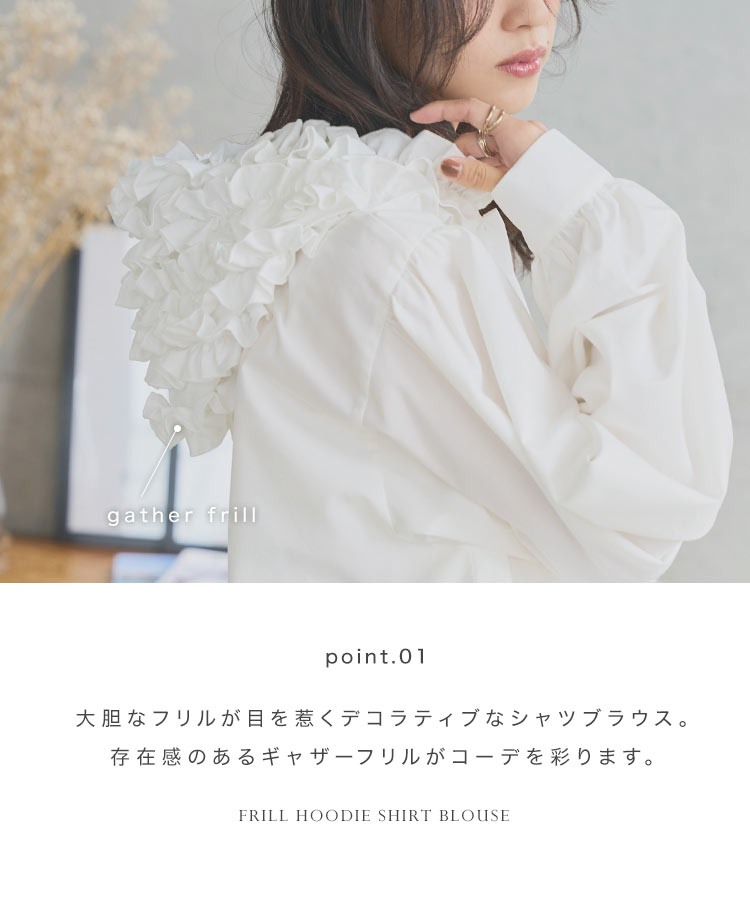 大胆なフリルデザインが目を惹くデコラティブなシャツブラウス。存在感のあるギャザーフリルがコーデを彩り、一枚で着映えさせるアクセント。フロントボタンを開けるとライトアウターとして羽織りでも着回していただけるフーディートップスです◎【素材・サイズ感】程よいハリ感のある綿混シャツ素材。ふんわり広がるフレア感にゆとりのあるオーバーサイズ感が華奢な女性らしさを演出。フリルをたくさんあしらったボリューミーなフードが360度どこから見ても華やかな表情に仕立ててくれる一着です◎※キャンセル/変更不可商品カテゴリ:20代 30代 40代 50代 Aライン ladies イエベ インナー ウェーブ おしゃれ おとな オフィス お出かけ お洒落 ガーリー カジュアル かっこいい カワイイ ギフト きれいめ キレイめ クール こうべれたす コーデ ジャケット シャツ シャツブラウス シンプル スタイルアップ ストレート トップス ナチュラル ニット ファッション フードシャツ フードブラウス フェミニン ブラウス フリフリ フリル プルオーバー ブルベ フレア プレゼント ベーシック ボタン ママ ゆったり ライトアウター レイヤード レディース 羽織り 可愛い 夏 快適 楽チン 軽アウター 高見え 骨格ウェーブ 骨格ストレート 骨格ナチュラル 仕事用 秋冬 重ね着 春 春夏 女 女性 上品 新作 真面目 神戸レタス 推し活 前開き 袖 体形カバー 体系カバー 大人 大人可愛い 定番 旅行 涼しい