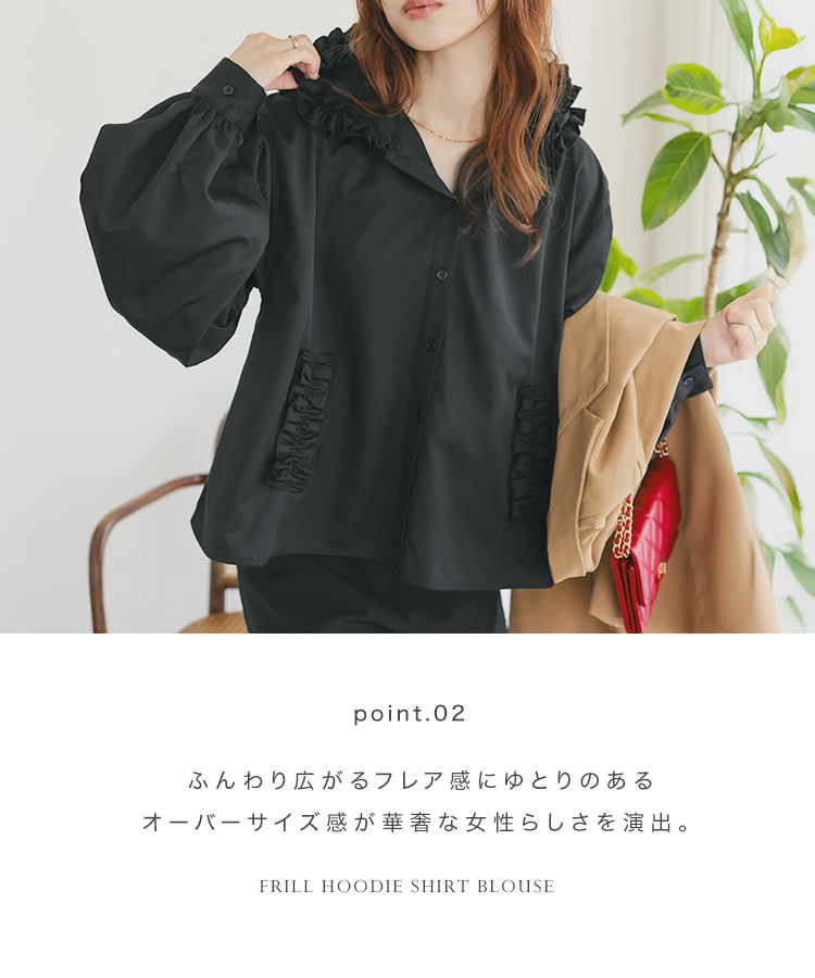 フリルフード シャツブラウス [C7645] レディース 秋 トップス ブラウス シャツ フードブラウス フーディー フード付き パーカー 羽織り 前開き フリル フリフリ Aライン フレア 体型カバー ゆったり ポケット 白 ホワイト 黒 ブラック フェミニン ガーリー 大人可愛い