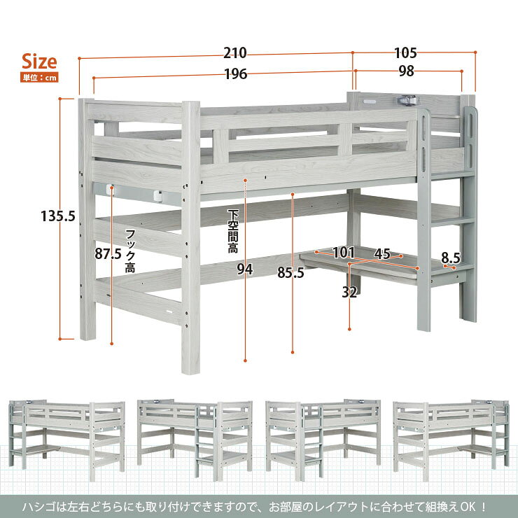 【特許構造】ロフトベッド eeny(イーニー) Low basic H135cm 4色対応 システムベッド 机付き 子供 大人 ロータイプ テーブル デスク 学習机 宮付き 棚 LED照明 コンセント システムベット おしゃれ