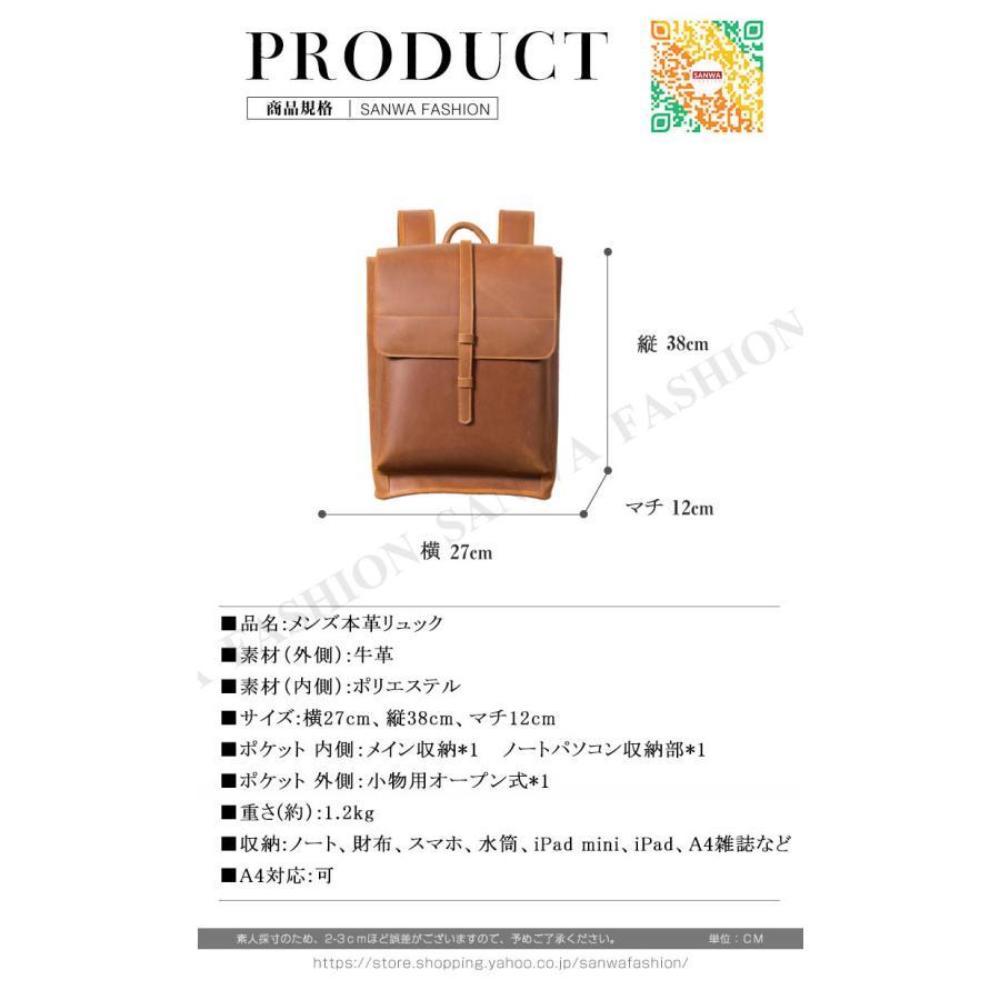 ■品名:メンズ本革リュック■素材(外側):牛革■素材(内側):ポリエステル ■サイズ:横27cm、縦38cm、マチ12cm■ポケット 内側:メイン収納*1 ノートパソコン収納部*1■ポケット 外側:小物用オープン式*1■重さ(約):1.2kg■収納:ノート、財布、スマホ、水筒、iPad mini、iPad、A4雑誌など■A4対応:可sanwafashion の人気検索ワード:リュック メンズ リュックサック 本革 牛革 デイパック ビジネス メンズバッグ バックパック レザー ショルダーバッグ 通勤通学 旅行 出張 アウトドア 自転車鞄 カバン おしゃれ トレンド 流行 カジュアル 革バッグ ファッション レザーバッグコーデ 通勤 通学 大人 男性 通販 人気 20代 30代 40代ミセス シンプル きれいめキレイめ 収納 人気 おすすめ 男女兼用