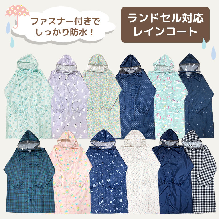 おしゃれなカラーが揃ったキッズレインコート♪ ランドセル、リュック対応だから、背負ったまま着用できます。 生地は表面撥水だけでなく、裏面防水TPUコーティングでしっかり防水! 【おすすめポイント】 ●スナップボタンとファスナーが付いた仕様で水の侵入をしっかり防ぎます。 ●生地裏面は防水TPUコーティング、表面には撥水加工を施してあるため、しっかり水濡れを防止。 ●ランドセルやリュック、通園カバンを背負ったまま着用可能だから、さっと着られてカバンなども濡れません。 ●顔まわりは透明になっているため、深くかぶっても視野が狭くならず安全です。 ●袖にはゴムが入っているため、しっかりとまって水の侵入を防ぎます。 ●後ろには長めに入った反射テープ付きだから、暗い夜道も安全に歩行できます。 ●レインコートと同じ柄の便利な収納袋付き! ●首の後ろにはループ付きでフックなどにもかけやすい♪ 【サイズ】 120cm 130cm 140cm 150cm 160cm ※詳しいサイズは商品ページ内のサイズ画像をご確認ください。 ※スタッフによるメジャー採寸のため若干の誤差がある場合がございます。予めご了承ください。 ※お使いのモニターにより若干色味が異なる場合がございます。お届けする商品は画像と同じものですので予めご了承いただけますようお願い申し上げます。 【素材】 ポリエステル 100% ※黒いファスナーを使用した商品では、生産時のアイロンがけにより裏面に色移りのあるものがございますが、衣服への色移りなど使用上に問題はございません。予めご了承の上、お買い求め下さいますようお願いいたします。 ※お届け時は折りたたんだ状態でお届けしますので、シワがついている場合がございます。数回お使いいただくか、低温でのアイロンがけによりシワは取れますのでご了承下さい。 (アイロンの温度が高くなると裏面の防水コーティングが溶ける場合がございます。様子を見ながら必ず低温で行って下さい。) ※お洗濯やアイロンの失敗による保証はお受けできませんので、お取り扱いには十分ご注意のうえご使用下さい。 【生地の色味について】 生産時期により色味に多少の違いがある場合がございます。予めご了承いただけますようお願い致します。 生産:中国予めご了承下さい ●お届け商品は開封時に「たたみじわ」がある場合があります。 立体形状部分は特にしわを避けられませんので、 予めご了承いただけますようお願い致します。
