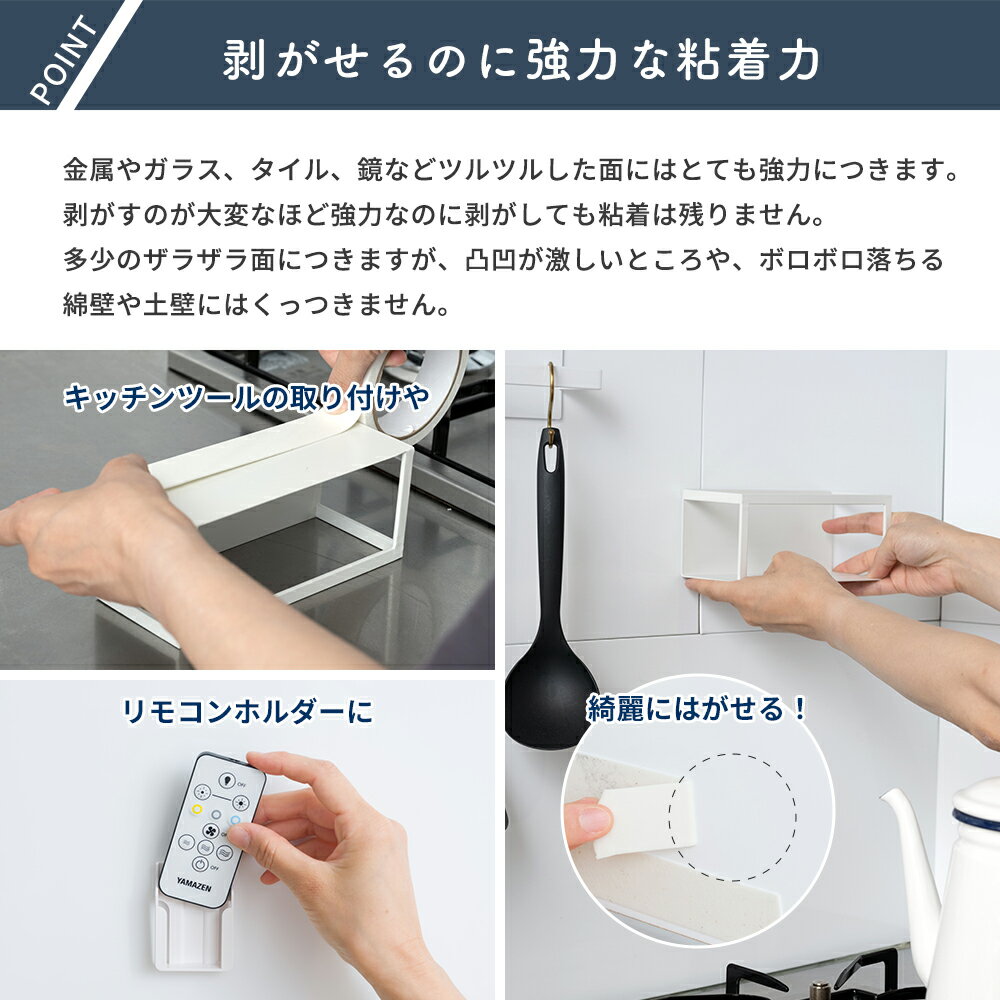 商品名 シニオンにおすすめ!剥がせる1mm厚 両面テープ 納期 即日出荷 在庫状況により、お時間をいただくこともございます サイズ 25mm×10m 厚み:1mm 材質 ポリエチレン発泡体、アクリル系粘着剤 重量 94g 用途 被着体に傷をつけず原状回復が必要な、金属・ガラス・プラスチック・樹脂・タイルなどの接合。POP作成等。 粘着力 (1面)4.39N/10mm(2面)3.35N/10mm ※この特性値は測定値の一例であり保証値ではありません。 おすすめポイント 剥がせるのにしっかり貼れる両面テープ。 1mmある厚手のフォームが被着面によく沿い、凹凸面にもぴったり貼り付きます。 友安製作所オリジナルの磁石がくっつくステンレスコーティングパネル SNiON(シニオン)に特におすすめです。 樹脂製見切り材にも対応。その他、一枚300g程度の軽量な壁材にもおすすめ。 友安製作所製品では、「ウッドパネル Hattee(ハッティ)」「組木ウッドパネル kumikki(くみっき)」「防水PVCパネルSottile(ソティーレ)シリーズ」におすすめです。 裏面テープの上から貼れば、剥がせるウォールパネルに早変わり。 ※Hattee(ハッティ)、kumikki(くみっき)は元のテープに重ねるため、厚み分浮きが出ますのでご注意ください。 壁材以外の用途にももちろん使えるので、賃貸DIY、リモコンホルダーやコンセントタップなどの固定にもおすすめ。 金属やガラス、タイル、鏡などツルツルした面にはとても強力につきます。 剥がすのが大変なほど強力なのに剥がしても粘着は残りません。 多少のザラザラ面につきますが、凸凹が激しいところや、ボロボロ落ちる綿壁や土壁にはくっつきません。 国産ビニールクロスで、表面に防汚コーティング加工されているものには貼りつきません。 (※逆に貼り付きが良すぎ表面を少し破壊する場合もあり、ほとんどの壁紙にはお使いいただけますが、当社としては壁紙には使用不可としています。) 使用方法 ■貼り方 ・貼りつける面のほこり・油分・水分などをよく拭き取ってください。 ・施工時は、テープを貼った部分を上からしっかり押さえてください。 ○圧着ローラーの使用がおすすめです。 ×叩いたりしないでください。周囲のテープが浮く原因となります。 ■剥がし方 ○貼り付け面と平行になるようにゆっくりと剥がす。 ×被着面から持ち上げるように引っ張って剥がさないでください。 ・剥がしにくい場合はドライヤーなどで温めると剥がしやすくなります。 商品のご注意 〇保管の仕方 ・テープを保管する場合は、直射日光を避け涼しいところに置いてください。 〇その他 ・電気絶縁用には使用しないでください。 ・テープは壁にしっかり押し付けて貼ってください。正しく貼れていないとテープの粘着強度にかかわらず剥がれが起きます。 ・SNiON(シニオン)に貼り付けの場合、マグネットを取り付ける前に数日間剥がれが起きないか様子を見てからご使用ください。 ・新設または防汚機能のある一般的な国産壁紙は、表面を傷つけることはありませんが貼り付かない場合があるためご使用はおすすめいたしかねます。 ・再剥離タイプの粘着剤を使用しておりますが、被着体の材質・表面状態および表面強度の弱い材質・貼り付け期間によって、粘着剤が残る場合や表面破壊、剥がれが起こる恐れがあります。あらかじめ試験の上ご使用ください。 ・火の近くや水が多量にかかる場所、屋外にはご使用にならないでください。 ・剥がれによる破損など当社は一切の責任を負いません。 ・テープを剥がす際は、ゆっくり剥がしてください。 ・凹凸の多いものには貼りつかない場合があります。 ・一度剥がしたものは粘着力が弱まっているためお使いいただけません。 ・人体(皮膚)には直接貼らないで下さい。かぶれる場合があります。 ご注文時のご注意 ・お客様のご都合による返品・交換・キャンセルのできない商品です。開封した商品の返品・交換は一切お受けできません。 ・出荷後の住所・送付先の変更は転送料が必要となりますので、ご注文前にお届け先住所を必ずご確認ください。 ・ご注文の前に当店のご注文規定を必ずご確認ください。 ご注文の際は、こちらのページの内容をご理解いただいたものと判断させていただきます。 両面テープ はがせる 強力 接着剤 施工 テープ はがせる 内装 壁 DIY シニオンにおすすめ!剥がせる1mm厚 両面テープ 賃貸 原状回復 施工道具 ポリエチレンフォーム アクリル系粘着剤貼って剥がせる強力両面テープ 剥がせるのにしっかり貼れる両面テープ。 1mmある厚手のフォームが被着面によく沿い、凹凸面にもぴったり貼り付きます。 友安製作所オリジナルの磁石がくっつくステンレスコーティングパネル SNiON(シニオン)に特におすすめです。 樹脂製見切り材にも対応。 その他、一枚300g程度の軽量な壁材にもおすすめ。 . Detail商品詳細