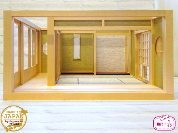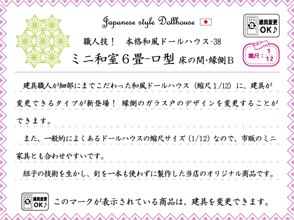 和風ドールハウス-38 ミニ和室6畳-ロ型 床の間・縁側B(1/12スケール)建具選択 木製 ベイヒバ 無塗装 横幅43.5cm 日本製 日本人職人手作り品