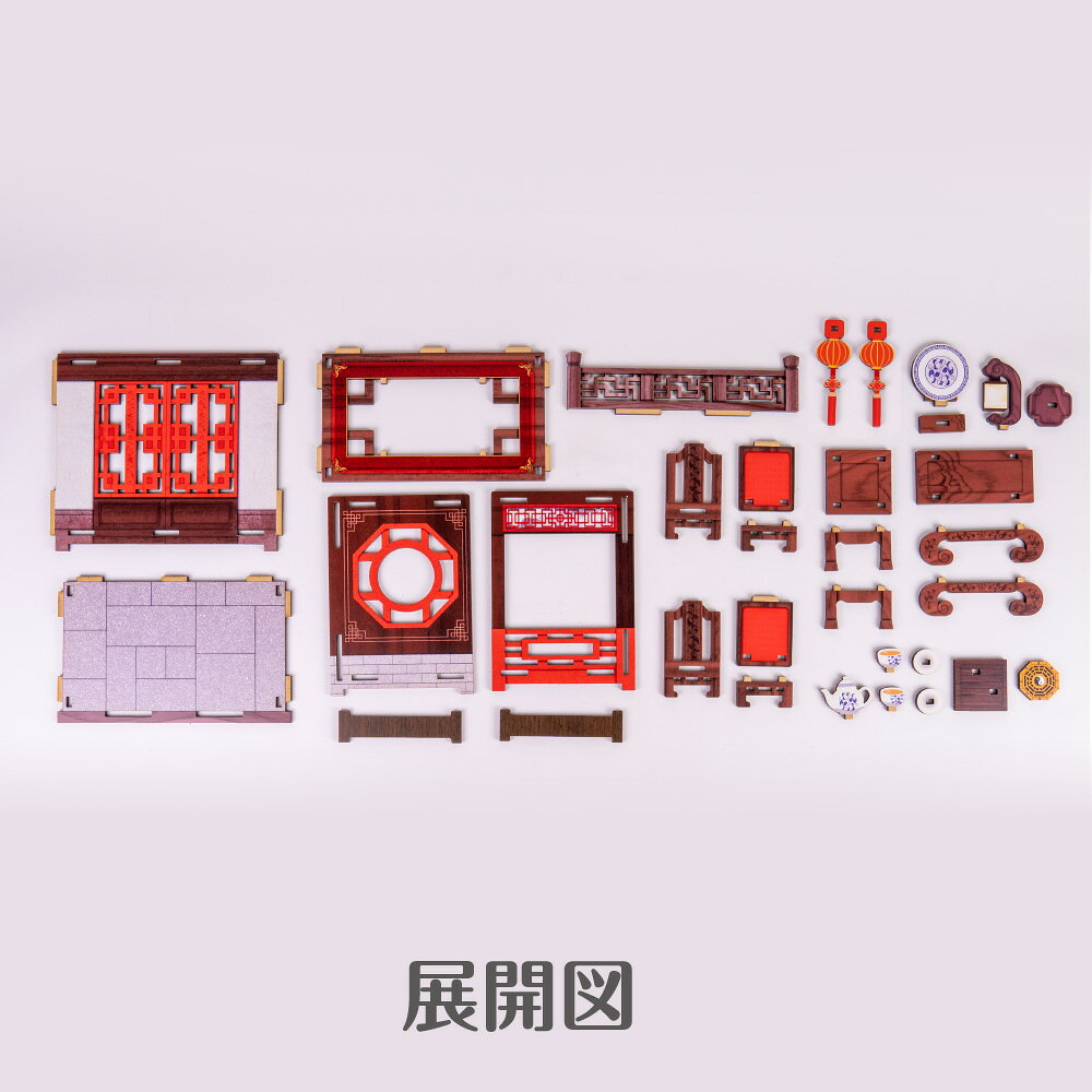 商品の仕様について 材質 MDF材 サンウッド柄(厚み4.0mm) 本体 外寸:幅177.2mm×高さ152.3mm×奥行き111.6mm 内寸:幅169.2mm×高さ127.5mm×奥行き98.7mm 付属品 卓2種・椅子2脚・茶器セット(カップ2個) ランプ・飾り皿・八卦・吊り提灯 重さ 本体:約280g 本体と付属物込み:約370g ご注意 ・写真のぬいぐるみ、ドールなどは付属しません。 ・商品は組み立て前の状態で納品となります。 組み立てについて 木製品のため湿度の変化によりある程度伸縮します。 組み立ての際、はめ込み部分がキツイ場合はヤスリなどで調整してください。 MDF材をレザーカットする際に、高温の影響でイラストが切れてしまう(印刷が剥がれる) 可能性がございます。 枠から外すときは裏面から押して外してください。 表面から外すと、印刷が剥がれる可能性があります。 ドールやぬいに焦げが付着する場合がございます。 ご使用前に水で濡らした布等を固く絞り、断面部分を拭いてください。飾れる場所は少ないけれど 推したちはかわいく飾りたい! 推しのマンションをあなたの家に建築しましょう! さらにミニ家具と小物がセットです! 「飾りたいけど置き場所が少ないから置けない…」という声にお答えして 飾るスペースと収納スペースを兼ね備えたマンションができました! 付属のHパーツを使えば、2階建て!3階建て!にすることが可能です! ねんどろいどや俵型ぬいなどの10cm台のフィギュアやアクスタ、ぬいぐるみが入室可能 15cm台のドール達は椅子に座らせるとぴったりサイズ! 1人用のお部屋にしても良し!2人並べて座らせても良しな横幅サイズ ミニ家具や小物がセットなのでミニチュアを持ってなくても大丈夫! 他のミニチュアなどと組み合わせて飾ればさらに遊び方は無限大です☆ 硬いものや鋭利なものが当たると傷が付く場合がございます。 写真のぬいぐるみ、ドールなどは付属しません。 木製品のため湿度の変化によりある程度伸縮します。 組み立ての際、はめ込み部分がキツイ場合はヤスリなどで調整してください。 MDF材をレザーカットする際に、高温の影響でイラストが切れてしまう(印刷が剥がれる) 可能性がございます。 枠から外すときは裏面から押して外してください。 表面から外すと、印刷が剥がれる可能性があります。 ドールやぬいに焦げが付着する場合がございます。 ご使用前に水で濡らした布等を固く絞り、断面部分を拭いてください。 3階建て以上にすることは耐久面等を考慮しますとお薦めいたしません。