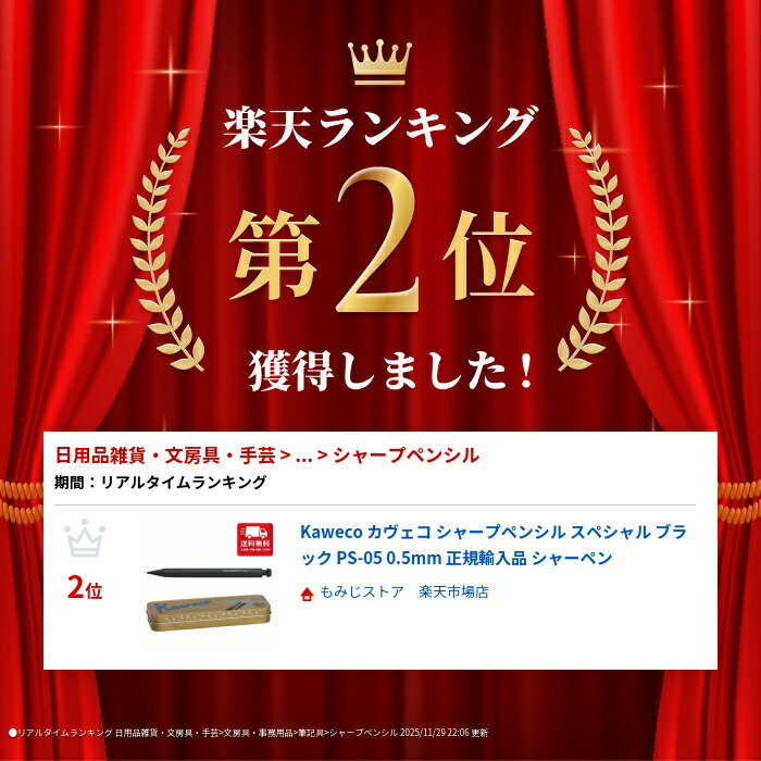 【Kaweco カヴェコ シャープペンシル スペシャル ブラック PS-05 0.5mm 正規輸入品】 1883年創業、ドイツの老舗筆記具ブランド 「Kaweco(カヴェコ)」から、 シンプルかつ機能美あふれるシャープペンシルが登場。 スペシャルシリーズは六角形のスリムなボディが特徴で、 手にしっくりと馴染み、 長時間の筆記でも疲れにくい設計です。 ◆ 特徴 ・精密な0.5mm芯で、スムーズな筆記を実現 ・ブラックアルマイト加工のシックなデザイン ・金属製の堅牢なボディで長く愛用可能 ・ビジネス、勉強、デザイン作業など幅広く活躍 ・正規輸入品のため安心してご使用いただけます ◆ サイズ・仕様 ・芯径:0.5mm ・シリーズ:Kaweco Special ・カラー:ブラック ・付属品:専用ケース ◆ ブランド紹介 Kaweco(カヴェコ)は、 130年以上の歴史を持つドイツの筆記具ブランド。 クラシカルで実用的なデザインと高品質な製造技術で、 世界中の愛用者に支持されています。 Kaweco カヴェコ シャープペンシル スペシャル ブラック PS-05 0.5mm 正規輸入品 シャーペン 勉強 ビジネス 仕事 文房具 筆記用具 ペン