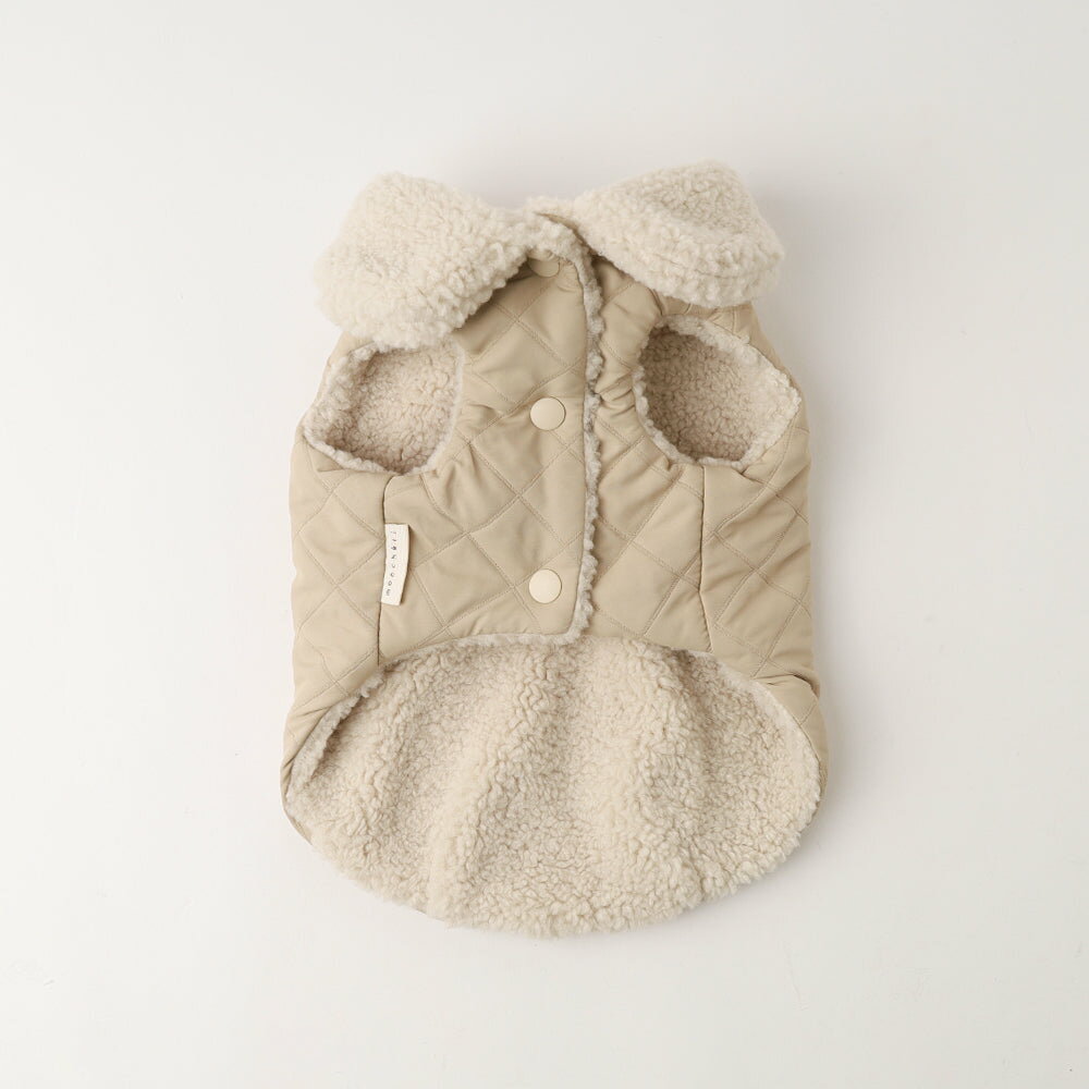 リバーシブルで着用できるシンプルなデザインで、ニュアンスカラーがおしゃれなベストが登場! 表面がキルティング、裏面はもこもこなボア素材で、2パターン楽しめます◎ 背中側はハーネスの上から着用できるようリード穴をお作りしました。 一枚着でも重ね着でも重宝するお勧めアウターです。 ■生地仕様 生地の厚さ:厚め 伸縮性:なし モデル ビションフリーゼ×トイプードル(クリーム)着用サイズM/体重2.8kg ビションフリーゼ(ホワイト)着用サイズM/体重3.1kg 素材 キルト側:レーヨン 80% ナイロン 20% ボア側: ポリエステル 80% 綿 20% サイズ 首回り(cm) 胸囲(cm) 背中側着丈(cm) お腹側着丈(cm) 目安体重(kg) XS 25 35 18 13 ~1.5 S 28 40 22 15 ~2 M 31 45 26 17 ~4 L 34 50 30 19 ~6 XL 37 55 34 21 ~8 DM 31 42.5 33 17 ~5 ◆商品画像は着用イメージです。 光や角度により、実物と色味が異なる場合がございます。 ◆記載サイズは、素材によって実物とは異なる場合がございますので、予めご了承ください。