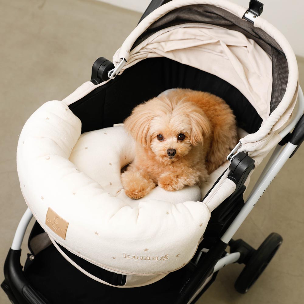 monchériオリジナルテキスタイル『お星さまとお月さま柄』の愛犬ちゃん用ペットカートネックピローの登場です! 生地はパイル生地を採用し、ブランケットのように肌触りの良く、オールシーズンでご使用いただけます。 仕様がアップデートされ、カバーはファスナーで取り外し可能となりました! 汚れたり匂いが気になる場合は、ファスナーでカバーが取り外し、カバーはネットに入れてお洗濯が可能です。 中クッションには小さなポケットが3か所付いており、暑い季節は保冷剤を、寒い季節はカイロを入れて快適にお過ごしいただけます。 お月さまのようにカーブした枕型のネックピローは愛犬ちゃんのお顔を優しく包み込んでくれます。 ペットカートの後方部に置くと、愛犬ちゃんをしっかりと支えるクッションにもなります♪ 体の小さい愛犬ちゃんにはペットカートの前方部に敷いておくと、前足を置いて快適に外の景色を楽しめます。 中綿をしっかりと詰めているので、移動時に愛犬ちゃんへの振動をなるべく軽減できるようになっております◎ 室内でも愛犬ちゃんのくつろぎ用枕としてご使用いただけます♪ ネックピローの端に付いているバックルを外し、ペットカートクッションピローのDカンに通しバックルで留めると、 クッションマットとクッションピローが離れることなく固定してご使用いただけます。 ペットカート内でネックピローがずれ動いてしまうので、バックルで接続してご使用ください。 【お洗濯方法】 ファスナーでカバーを外し、カバーはネットに入れて洗濯機でお洗濯可能です。 中クッションは、汚れた部分を優しく手洗いをおすすめいたします。 洗い流した後、中綿が端に偏らないように平らに広げて風通しの良い陰干し乾燥をしてください。 同じ生地を使用したシリーズ商品も登場です! 愛犬ちゃんのために、おでかけ用グッズを揃えてみるのはいかがでしょうか?♡ ・冷感ポケット付きネックカバー【名入れ刺繍対応】【保冷剤付き】 ・お星さまとお月さま柄パイルペットカートクッションマット ・お星さまとお月さま柄パイルあごのせクッションカバー【名入れ刺繍対応】 ■生地仕様 生地の厚さ:普通 伸縮性:なし モデル ポメラニアン×トイプードル(ベージュ)着用サイズM/体重2.8kg 素材 表地:綿100% 中綿:ポリエステル100% 裏地:ポリエステル100% サイズ 高さ(cm) 幅(cm) 奥行(cm) 重量(g) S 6 33 21 162 M 7 38 28 246 ◆商品画像は着用イメージです。光や角度により、実物と色味が異なる場合がございます。◆記載サイズは、素材によって実物とは異なる場合がございますので、予めご了承ください。