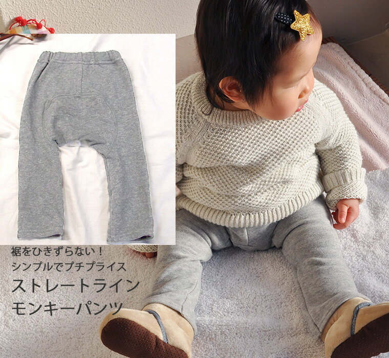 素材 身生地:綿100% サイズ A B C D E F 総丈 股上 股下 ウェスト 太もも 裾 70cm 42 24 16 20 10 10 80cm 44 25 18 21 10.5 10.5 90cm 45 25 20 22 11 11 95cm 47.5 25 22.5 22.5 12 12 100cm 51 26.5 25.5 24 12 12 伸縮性 伸縮性★★★★☆ カラー ブラック ライトグレー ネイビー ブラウン モカ パープル チェリーピンク ピーチ アイボリー 商品説明 綿100%で桃のような暖かみのある肌触り。履き易さ抜群!シンプルで合わせやすさ抜群! 素材的には定番ですが、 形的にもシンプルなモンキーパンツですが、 実はなかったね………のこの1点です! お客様からの強いご要望でスタッフ一同納得! シンプルだからこそ、心地いい素材だからこそ、使いやすいんです。 今回は9色取り揃えました。 日本製・NOホルマリンなので、ファーストセパレートにも最適! 出産祝いにも喜ばれそうですね♪ 【メール便可商品です】 【ラッピングについて】贈り物でラッピングをご希望のお客様はこちらをご確認ください ギフトボックス(熨斗可・462円)と簡易ラッピング(103円)のみ承ります。メッセージカード(代筆可)もご用意しております お使いのデバイスにより、実際の商品と 色が異なって表示される場合がございます。 【お急ぎの方は・・・】 当店は、全品おまかせ配送となります。 宅配便をご希望の方・お急ぎの方は「お急ぎチケット」をご購入ください。商品と同時購入で、宅配便に変更させていただきます。 お急ぎチケットはこちら よくある質問(F&Q)人気NO.1桃素材のモンキーパンツに腹巻付きが登場! ↓ ↓ ↓ ↓ ↓ ↓ ↓ ↓ ↓ ↓ ↓ ↓ ↓ 綿100%で、まるで桃のようにやさしい暖かみのある肌触り。 裏毛の表面をやや毛羽立たせた素材で、保温性がありながらも蒸れにくく、秋冬にぴったりです。 綿100%で、桃のようにやわらかくあたたかみのある肌触り。 履きやすさはもちろん、シンプルだからどんなコーディネートにも合わせやすいモンキーパンツです。 一見ベーシックな形ですが、「探してみるとなかなか無かった!」というお客様の声から誕生しました。 スタッフ一同も納得の、使いやすさ抜群の1枚です。 日本製・NOホルマリンで安心素材なので、ファーストセパレートにもおすすめ。 出産祝いのギフトとしても喜ばれるアイテムです。 また、裏起毛は暖かさが魅力的ですが、汗を吸わないため冬でも動き回るシーンには不向きなことも。 実際に裏起毛NGの保育園もあるそうです。その点こちらは綿素材で安心。 さらに「あえての8分丈」が転びにくく安全だと、ご好評いただいています。 特に海外製などは、量産するため裁断するのに生地を何枚も何枚も重ねて、上からいっきに裁断します。 なので、部分的に、斜形したりします。(目地が斜め向いたりする) だから、何回か、お洗濯しただけで、よれたりしてくる商品も多いです。 でも、当店は、日本製ならではの丁寧さにこだわって、1枚1枚、熟練の裁断士が丁寧に裁断しています。 縫製は、大阪近辺で、ベビー服一筋の縫製工場で、熟練の職人さんたちに頼んでいます。 海外製品に比べて、日本製は縫製の手もきれいで、また環境下にも気をつかっています。 完成した製品は、大阪市内にある当社にて保管しています。