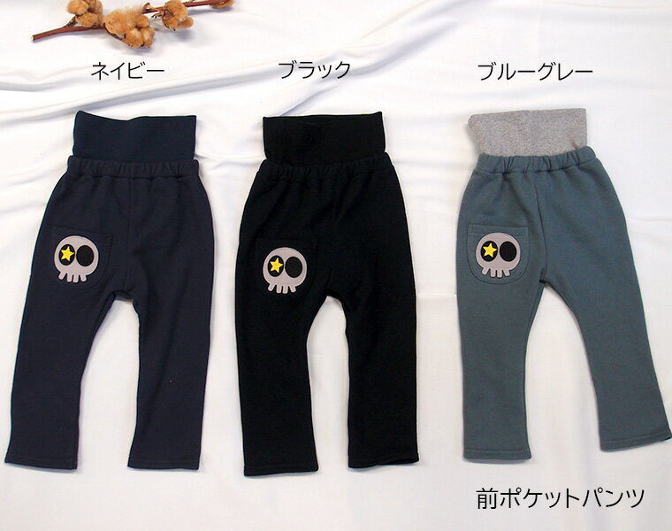 【全品対象選べる福袋開催中!】【在庫処分!】前ポケット スカルワッペン 腹巻付き 冬のストレートパンツ桃のような少し起毛したふんわり綿100%素材(80cm 90cm 95cm 100cm)1923