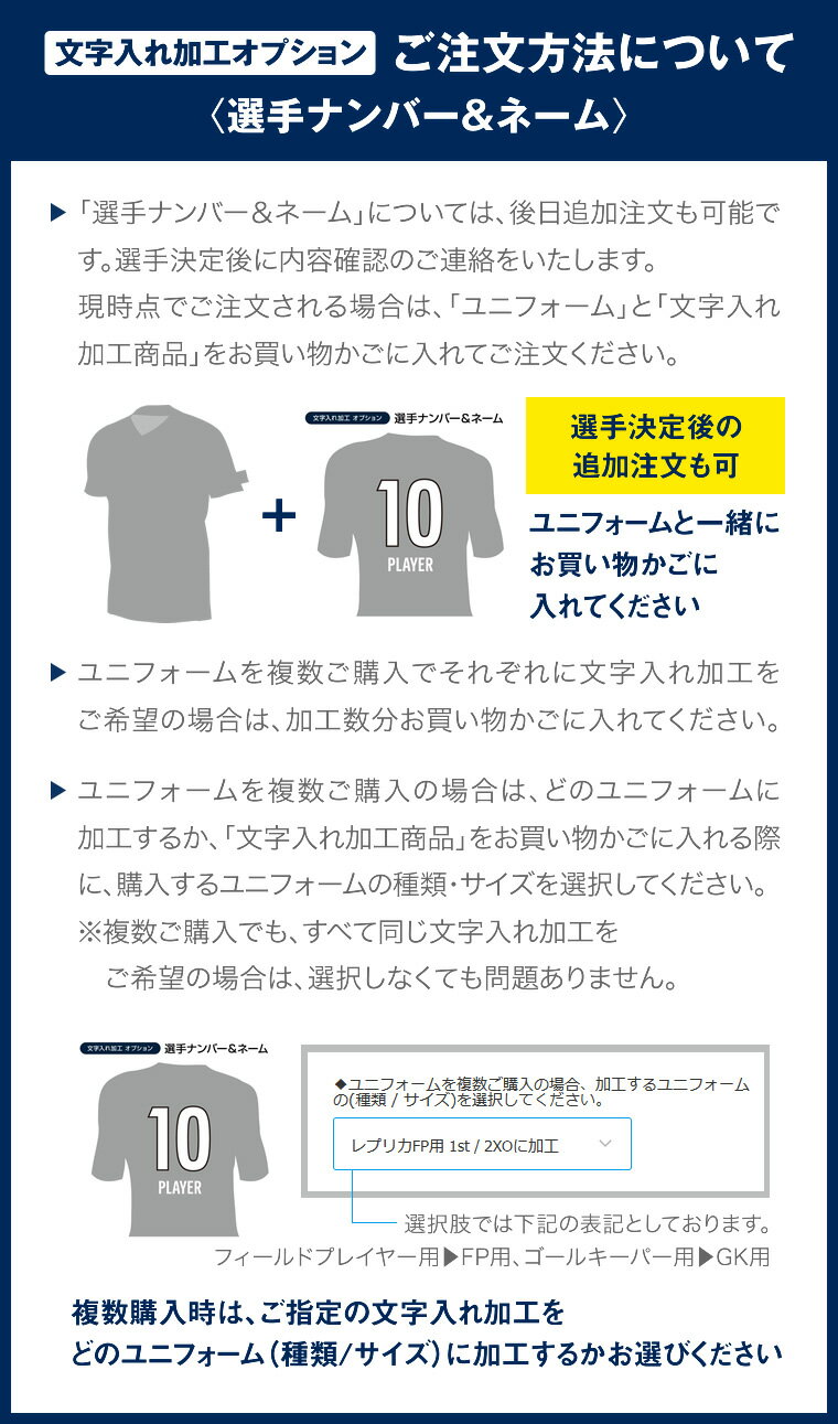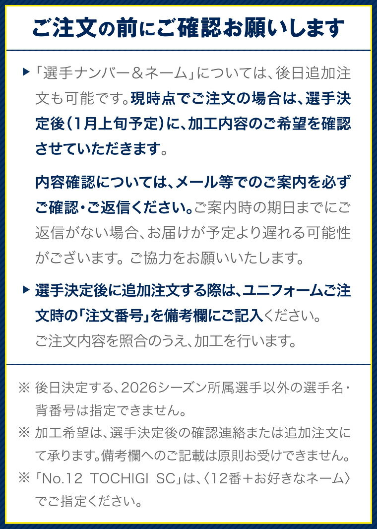 ユニフォームの選手名には正式に登録されたネームが入ります(登録以外の選手名・背番号は対応致しません)。 ※ご注文前に画像内の確認事項をご確認ください。 ※ユニフォームのご注文が確認できない場合はキャンセルいたします。 ※画像はイメージです。 ※2026シーズンモデル以外のユニフォームへの加工受付はできませんのでご了承ください。 品名 文字入れ加工〈選手ナンバー&ネーム〉 発売元 TOCKEY SQUARE宇都宮市馬場通り4-2-19 1F株式会社栃木サッカークラブ宇都宮市二番町1-7
