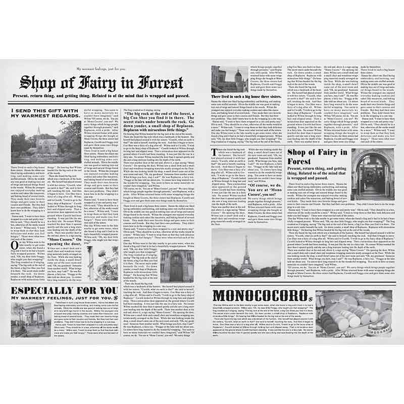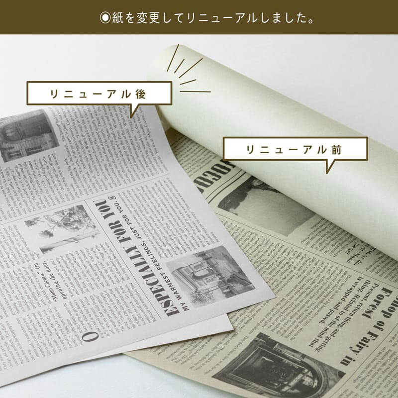 ●サイズ…A2(H42×W59.4cm) A4(H29.7×W21cm) ●素 材…紙(更紙) ●内 容…A2(10枚入/100枚入) A4(50枚入) ●日本製(モノココロ) ※A4サイズの柄の入り方は商品によって異なります。 予めご了承ください。英字新聞風デザインの包装紙 – シンプル&スタイリッシュなラッピングに 英字新聞のようなデザインが魅力の包装紙。 グレーの更紙にモノクロ印刷を施し、シンプルながら洗練された雰囲気に仕上げました。 ナチュラルなラッピングにも、クールでスタイリッシュな演出にもぴったり。 更紙ならではの柔らかい質感で包みやすく、贈り物や商品のラッピングはもちろん、 クラフトやDIYにも活躍します。 ------------------------------------------------------------------------------------------------------------------------------------------- デザインそのまま、価格をもっと手軽に こちらの商品は、包装紙-13029-英字新聞Tのリニューアル品です。 材料の価格高騰に対応し、材質や色数を抑えることで、お求めやすい価格を実現しました。 見た目の美しさはそのままに、より気軽に使えるアイテムへ。 これからも、使いやすく魅力的な商品づくりを続けてまいります。 ------------------------------------------------------------------------------------------------------------------------------------------- お す す め 商 品 両面使えるリバーシブル包装紙クラフトブラウンT ラッピングを楽しむ包装紙英字新聞モチーフ クラフト紙のクラシカルなアンティーク道具 鳥、リス、木、どんぐり、きのこ。森をイメージした北欧テイストのグリーンの包装紙 ボタニカル調の優しいデザインが素敵な雰囲気のフラワー包装紙