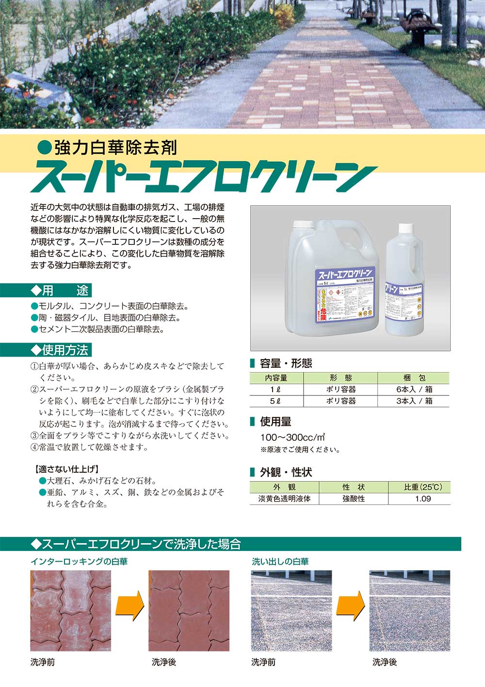 キーワード ヤブ原産業 スーパーエフロクリーン 白華現象 エフロレッセンス エフロ 強力白華除去剤 モルタル コンクリート ブロック タイル 溶解除去 水洗い 表面に白い生成物商品説明 メーカー名 ヤブ原産業 商品名 スーパーエフロクリーン 特長 一般に白華現象とは、セメント中の水酸化カルシウムが流出して表面に表れ、空気中の炭酸ガスと反応して炭酸カルシウムとなる現象をいいます。 この炭酸カルシウムは「白華」「エフロレッセンス(エフロ)」と呼ばれ、コンクリートやタイル、ブロックの表面に付着して美観を損ないます。 また、近年の白華は大気中の排気ガス、工場の排煙などの影響により特異な化学反応を起こし、一般の無機酸にはなかなか溶解しにくい物質に変化しているのが現状です。 スーパーエフロクリーンは、数種の成分を組み合わせることにより、この変化したエフロ(白華)を溶解除去する強力白華除去剤です。 コンクリート、タイル、インターロッキング等のエフロ(白華)除去に最適です。 作業も塗布と水洗いだけなので簡単にエフロを除去できます。 用途 モルタル、コンクリート表面のエフロ(白華)除去。 陶・磁器タイル、目地表面のエフロ(白華)除去。 インターロッキング表面のエフロ(白華)除去。 洗い出し表面のエフロ(白華)除去。 その他セメント二次製品表面のエフロ(白華)除去。 【適さない仕上げ】 ■大理石、みかげ石などの石材。 ■亜鉛、アルミ、スズ、銅、鉄などの金属およびそれらを含む合金。 使用量 100〜300cc/平米 ※原液でご使用ください。 外観・性状 外観:淡黄色透明液体 性状:強酸性 比重(25℃):1.09 ご購入注意事項 <ご購入前に下記内容をご確認ください> ▲メーカー直送、お取り寄せ商品のため、返品・交換を受けられませんので予めご了承の上お買い求めください。