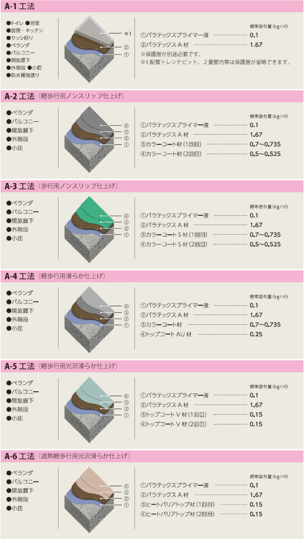 キーワード パラテックス 水性樹脂エマルション 無機粉体 安全性 耐亀裂性 追従性 防水性 シームレスな防水層 自閉樹脂塗膜防水 防水材商品説明 メーカー名 大関化学工業 商品名 パラテックス 特長 1.安全性 水性樹脂エマルションと無機粉体が原材料なので、有毒ガスの発生や火気による引火の危険性がありません。 また、パラテックスB-5工法、EP-ライニング工法で施工した水槽の水質は飲料水基準に適合しています。 2.耐亀裂性 柔軟性のある樹脂を高比率で使用しているので、コンクリート下地に生じる亀裂に対する追従性に優れ、水の浸入を防ぎます。 万一コンクリートとともに防水層が破断した場合でも、防水層破断部が水分を吸収し体積膨張して、更に特殊添加成分が亀裂断面間での相互作用を促進し、化合物を形成することで自閉します。 3.防水性 現場塗工型であるため、役物等の箇所でも納まりがよく、シームレスな防水層を形成するため、優れた防水性能を有します。 4.施工性 1回で規定の厚みが確保できるよう粘度調整してあります。 含湿下地への施工が可能です。 役物廻りなどの複雑な箇所にも容易に施工でき、工期短縮につながります。 5.耐久性 耐候性、耐薬品性に優れた樹脂と耐食性の高いアルミナ系セラミックスを使用することにより、総合的な耐久性に優れた強靭な防水層を形成します。 6.接着性 樹脂とアルミナ系セラミックスとの相乗効果でコンクリート躯体等の下地と強固に接着し、地下埋め戻し部の圧密沈下による防水層の破断や、躯体と防水層間への水の浸入を防ぎます。 セメント系上塗り材や各種上塗り材との接着性も良好です。 材料 ●パラテックス原液(防水原液) 耐水性、耐アルカリ性に優れた特殊変性のエチレン酢酸ビニル系共重合樹脂エマルションであり、各種防水工法の基本材料です。 乳白色液体 石油缶18kg ※プライマー液:水20倍希釈 ●パラテックスA混和剤 パラテックス原液とともに使用する各種防水工法の基本材料です。 茶褐色粉体 クラフト袋12kg ●パラテックスB混和剤 パラテックス原液とともに使用する各種防水工法の基本材料です。 茶褐色粉体 クラフト袋15kg 注意事項 < ご購入前に下記内容をご確認ください > ▲石油缶、粉体商品は、返品・交換を受けられませんので予めご了承の上お買い求めください。