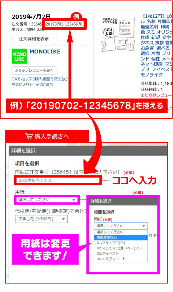 商品説明サイズ【名刺】91mmx55mm 材質【選べる用紙】4種類・マシュマロ・マシュマロナチュラル・アイベスト・エスプリコート【厚さ】180kg色 【印刷】黒1色商品説明 100枚入り普段名刺をたくさん使われる 営業の方に最適☆ビジネス&プライベートにもどうぞご購入後、備考欄もしくはメールにて 入力情報をお知らせ下さい。データご確認後に印刷・発送となります。以前、↓の片面モノクロ名刺プラス裏面追加オプションをご購入頂いたお客様限定の再版用サービス商品となります。↑【1枚12円】50枚 オリジナル 名刺 片面印刷 お試しにどうぞ名刺 印刷 【50枚】 1色 スミ オリジナル 制作 入力 作成 新規 文字 黒 お試し ビジネス 挨拶 営業 個人 少部数 お急ぎ 選べる テンプレート 選択 片面 プリント オンデマンド 個性 メール便 対応 送料お得 ネット印刷 シンプル 校正 カード ショップ 会社 モノライク送料無料 900円(税込み)↑【1枚12円】100枚 オリジナル 名刺 片面印刷 ビジネスに最適名刺 印刷 【100枚】 1色 スミ オリジナル 制作 入力 作成 新規 文字 黒 お試し ビジネス 挨拶 営業 個人 少部数 お急ぎ 選べる テンプレート 選択 片面 プリント オンデマンド 個性 メール便 送料無料 ネット印刷 マシュマロ エスプリ アイベスト ナチュラル モノライク送料無料 1,180円(税込み)↑初めてご購入の方は上の画像から↑リピート注文について●枚数は1注文につき100枚とさせていただきます。前回50枚でご注文頂いたお客様につきましても再版のご注文は100枚(1注文毎)からとさせていただきます。●この商品のご購入には前回のご注文番号が必要となります。前回ご注文番号は購入履歴よりご確認いただけます。購入履歴はこちらからご確認いただけます。購入履歴より「MONOLIKE」片面モノクロシンプル名刺の履歴からご注文番号の「356454-」以下の番号を控えていただき、ご購入時に「前回ご注文番号」の枠内にご記入ください。ご要望に応じ用紙は変更ができます!用紙は下の4種類より変更することができます。変更なしの場合はご購入手続きから「用紙変更なし」をお選び下さい。用紙変更をご希望の場合は用紙の種類をお選び下さい。この商品については印刷イメージのご確認はいたしません。前回ご注文いただいた際に作成したデータにて印刷・発送いたします。前回印刷データの一部変更がある場合は購入履歴より「再度購入する」をお選びいただき、【※リピート注文の場合ご選択ください】の選択肢から「リピート注文(内容変更あり)」をお選びください。データの変更・修正等がある場合は割引の対象外となりますのでご了承ください。ロゴ・QRコード・裏面の追加のオプションをご希望の場合は下のページからオプション商品と同時購入して下さい。↓↓↓↓↓↓↓↓↑【1枚12円】50枚 オリジナル 名刺 片面印刷 お試しにどうぞ名刺 印刷 【50枚】 1色 スミ オリジナル 制作 入力 作成 新規 文字 黒 お試し ビジネス 挨拶 営業 個人 少部数 お急ぎ 選べる テンプレート 選択 片面 プリント オンデマンド 個性 メール便 対応 送料お得 ネット印刷 シンプル 校正 カード ショップ 会社 モノライク送料無料 900円(税込み)↑【1枚12円】100枚 オリジナル 名刺 片面印刷 ビジネスに最適名刺 印刷 【100枚】 1色 スミ オリジナル 制作 入力 作成 新規 文字 黒 お試し ビジネス 挨拶 営業 個人 少部数 お急ぎ 選べる テンプレート 選択 片面 プリント オンデマンド 個性 メール便 送料無料 ネット印刷 マシュマロ エスプリ アイベスト ナチュラル モノライク送料無料 1,180円(税込み)