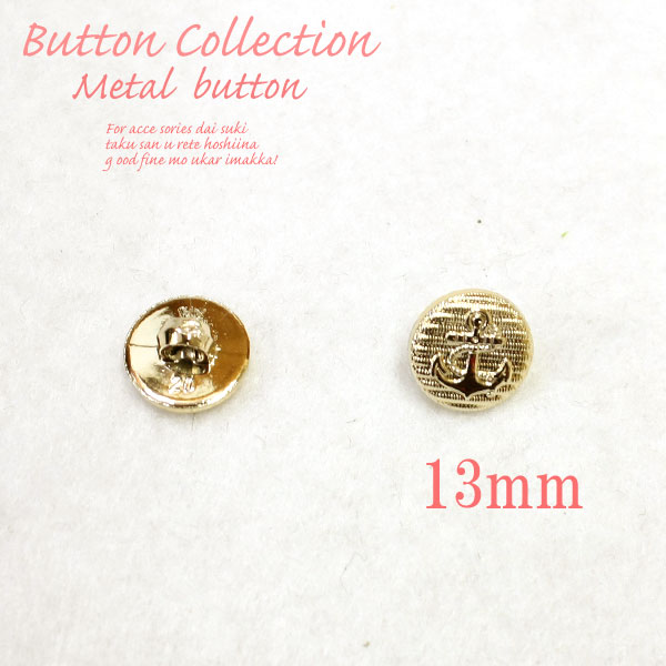 アンカーモチーフゴールドプラメッキボタン 内容:直径13mm プラメッキボタン 1個 カラー:ゴールド 素材:プラメッキ 直径:約13ミリ ※商品写真はできる限り実際の色に近づけるよう加工 しておりますが、お客様のご使用のモニターにより 実際の商品の色と異なって見える場合がございます。 予めご了承ください。
